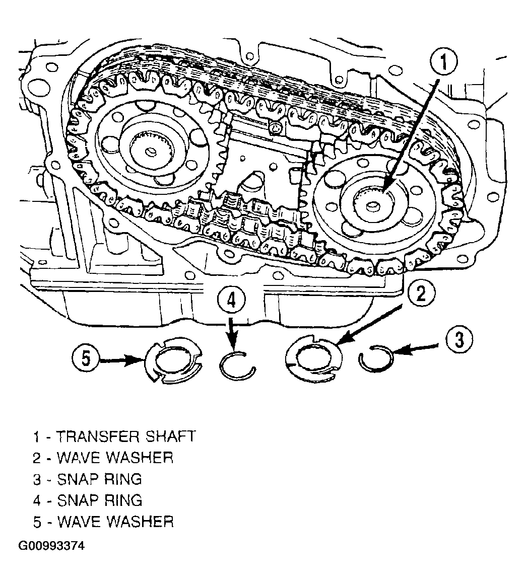 - Remove transfer shaft sprocket snap ring and wave washer. See Fig 5.