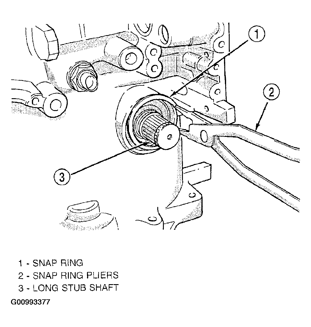 - Using suitable snap ring pliers, remove long stub shaft snap ring. See Fig 8.