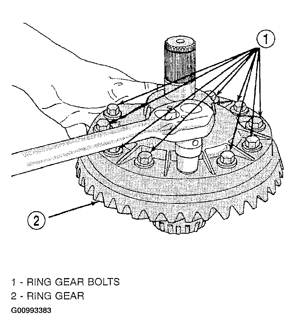 - Remove ring gear-to-carrier bolts. See Fig 14.