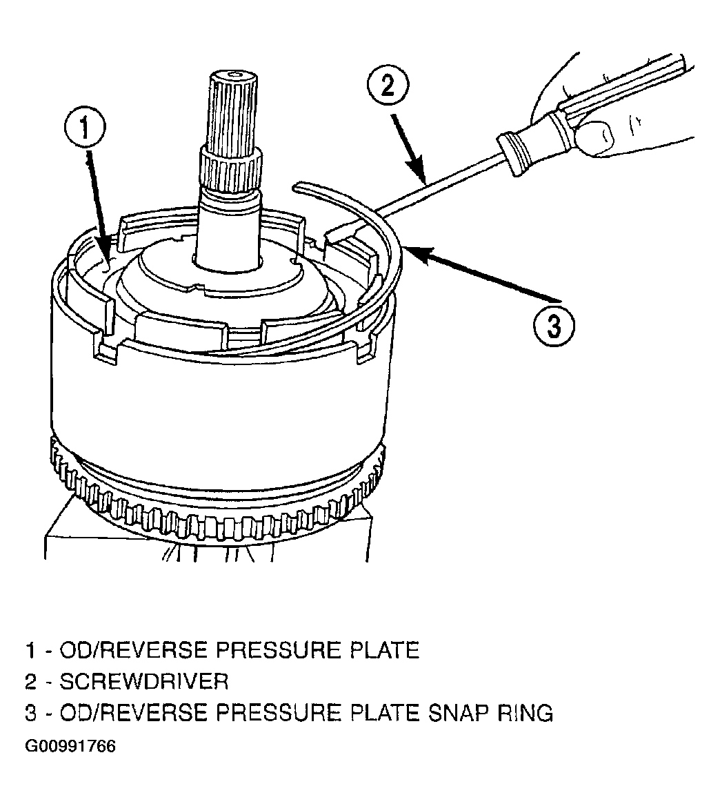 - Remove the OD/Reverse reaction plate snap ring. See Fig 6.