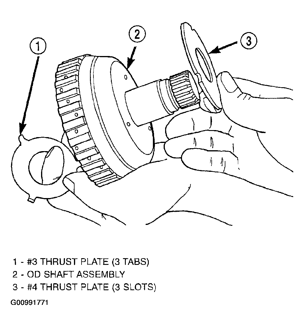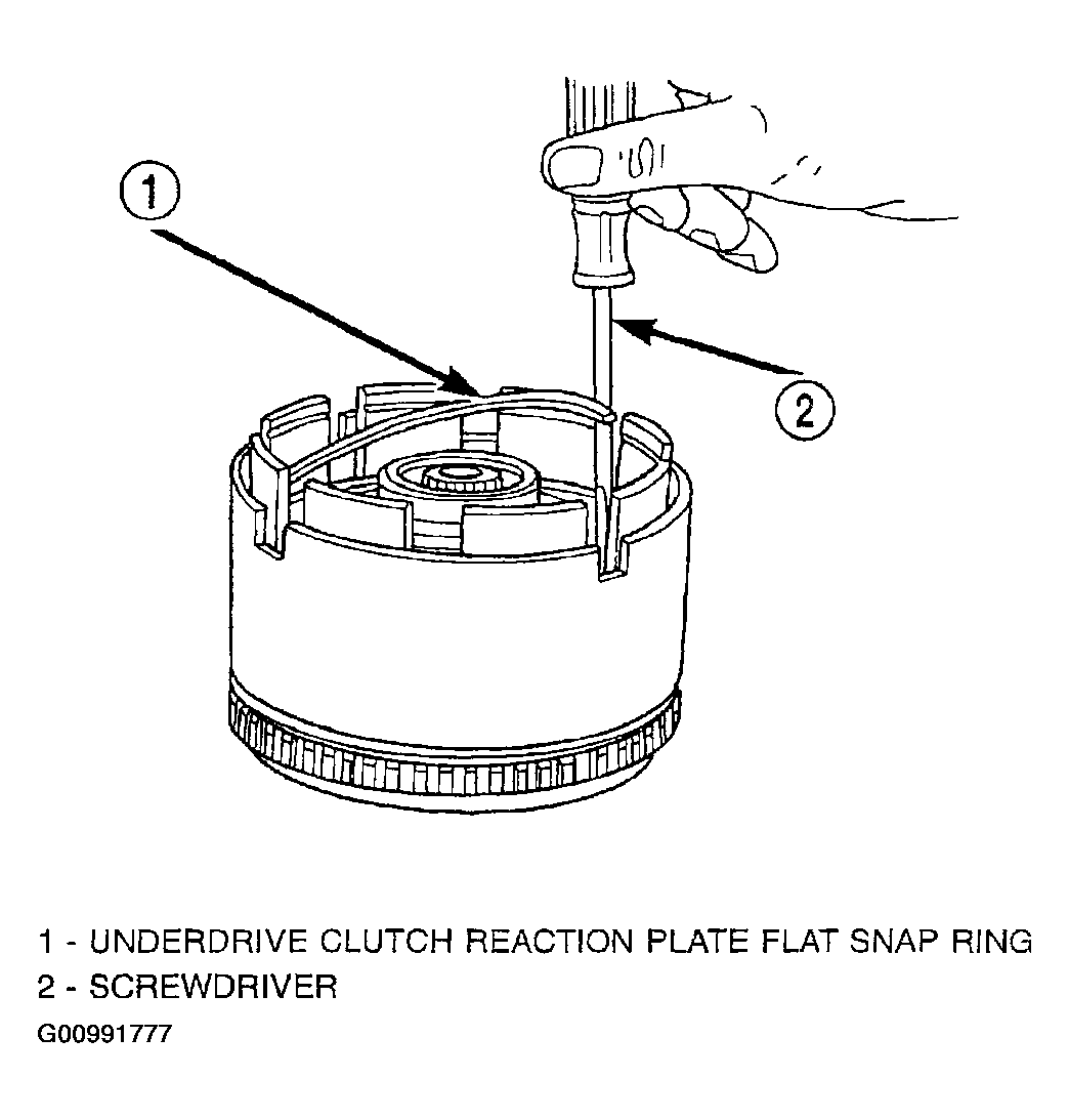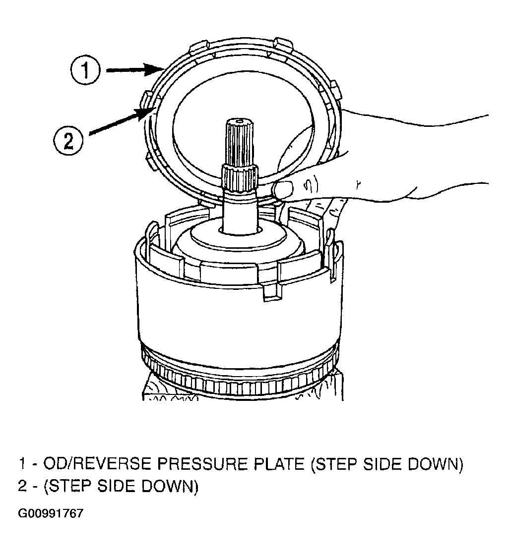 The OD/UD clutch reaction plate has a step on both sides. Install the OD/UD clutches reaction plate tapered step side up.
