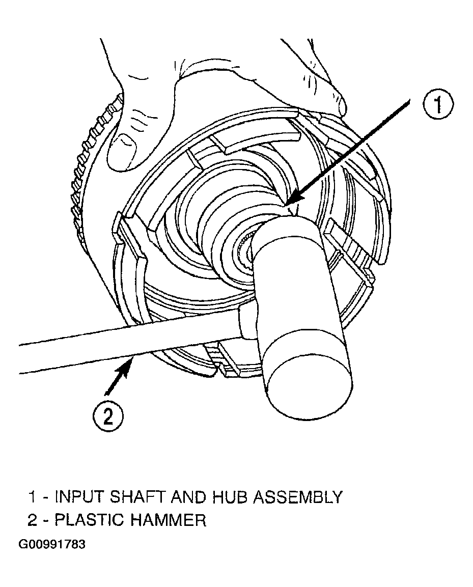 - Tap on input hub with soft faced hammer and separate input hub from OD/Reverse piston and clutch retainer. See Fig 23 and Fig 24