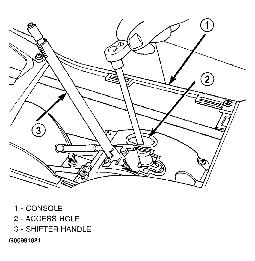 - Disconnect interlock cable from shifter base slot. See Fig 3. Be careful not to break tab on interlock cable conduit end fitting.