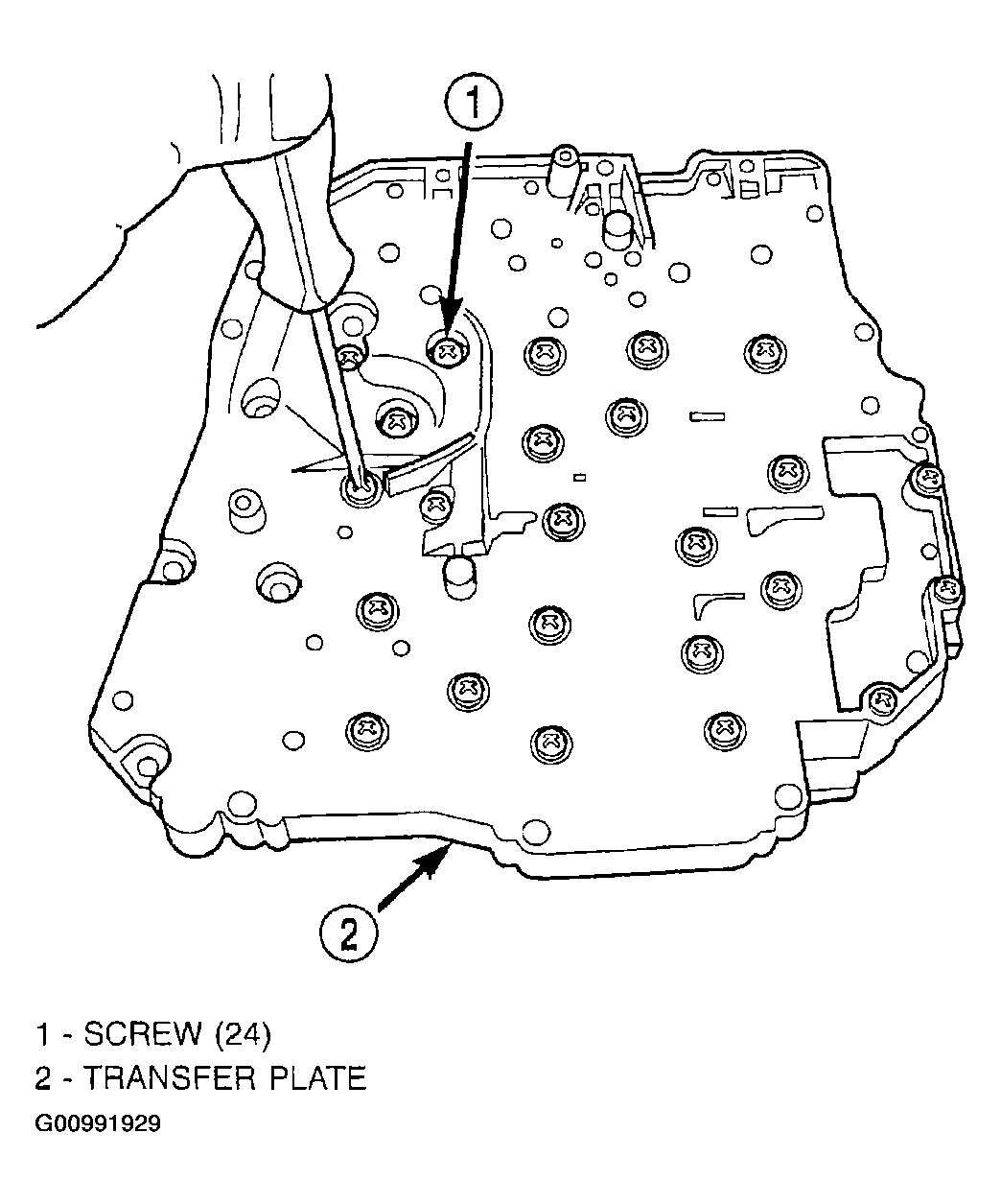 - Invert valve body assembly and remove transfer plate-to-valve body screws. See Fig 5.