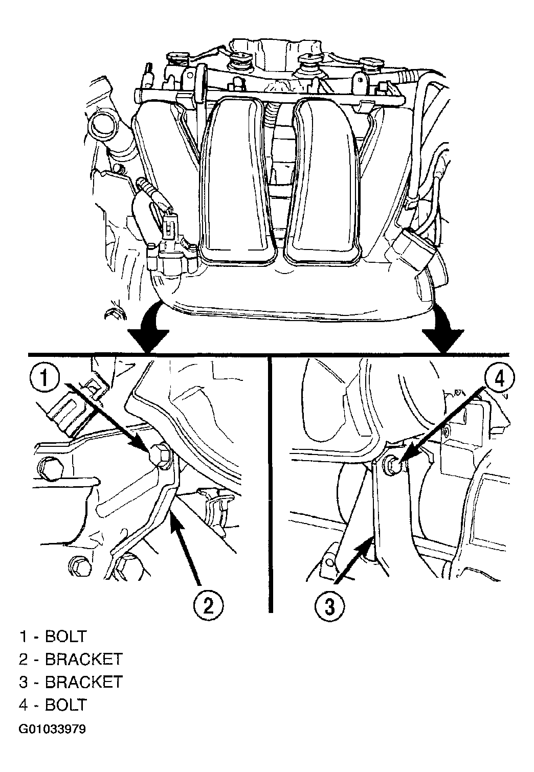 - Install intake manifold to lower support bracket bolts. (Figure). Tighten bolts to 11 N.m (95 in. lbs.).