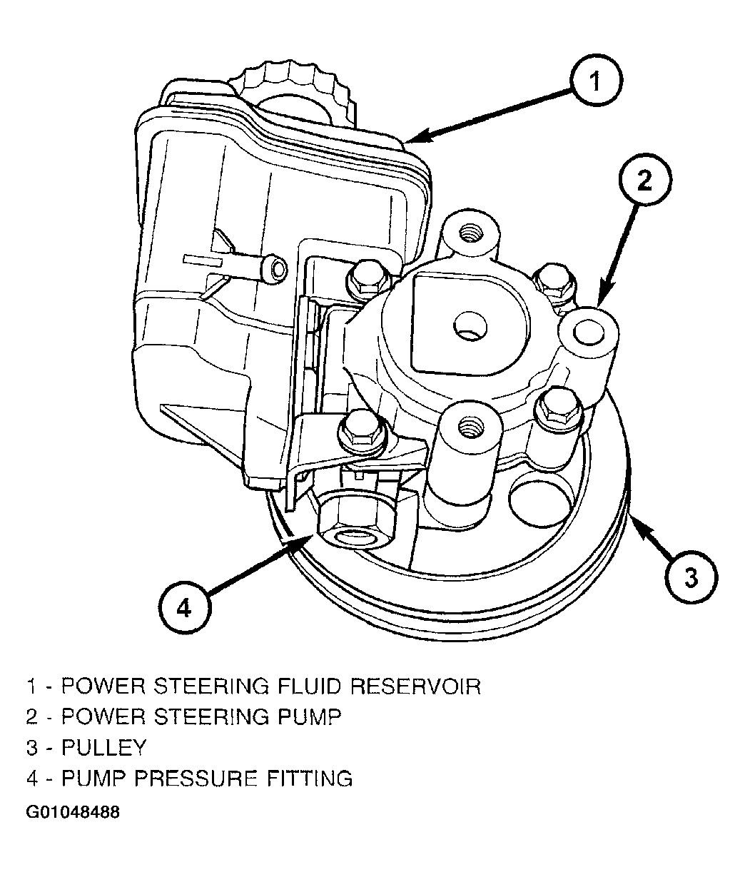 No repair procedures are to be done on the internal components of the power steering pump. The only serviceable components of the power steering pump are the power steering pump pulley and the pump itself. The power steering fluid reservoir is serviced with the pump.