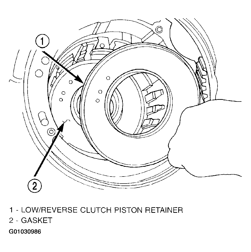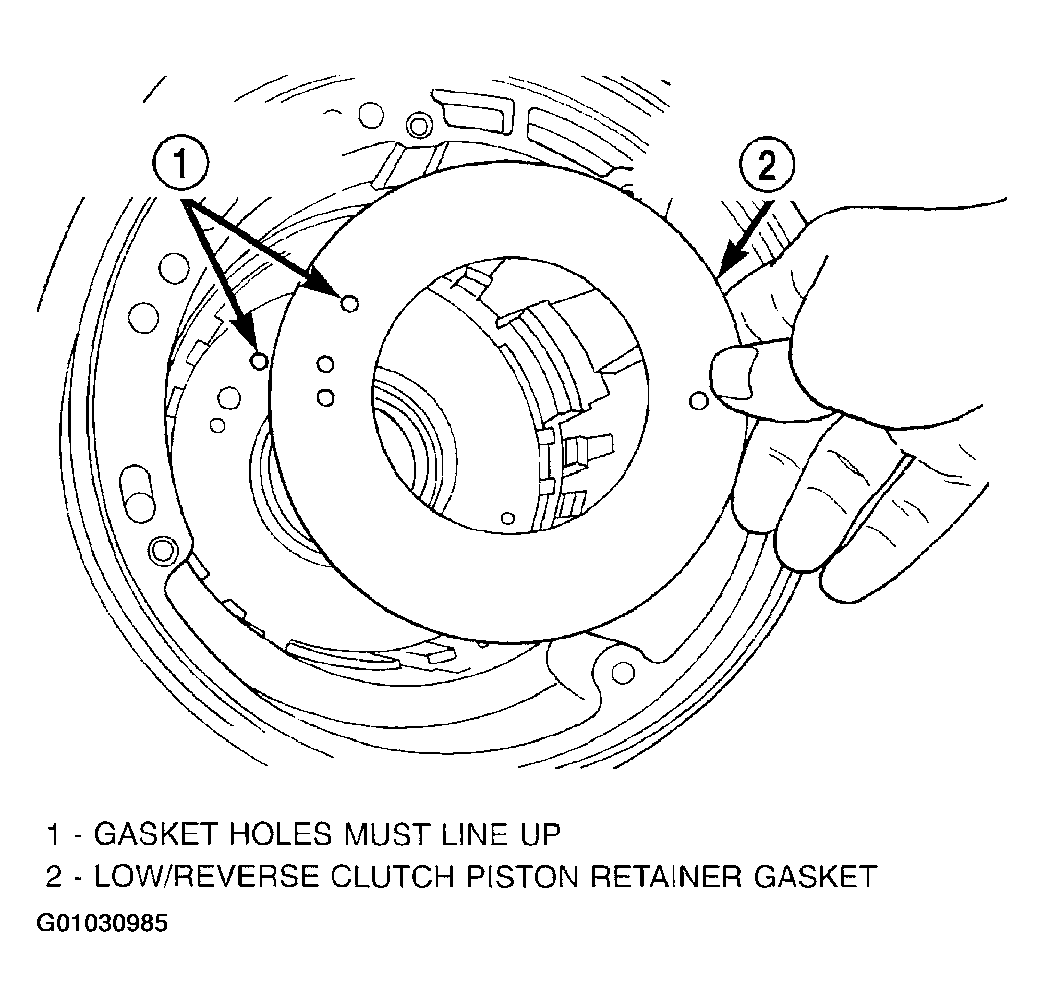 2. Install low/reverse piston retainer gasket. (Fig 2). Make sure gasket holes line up with case.