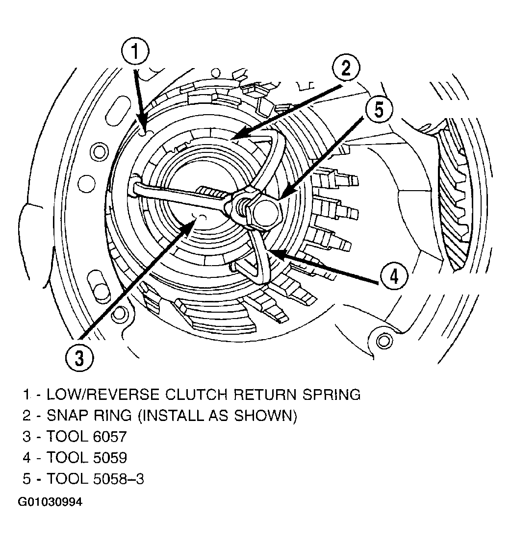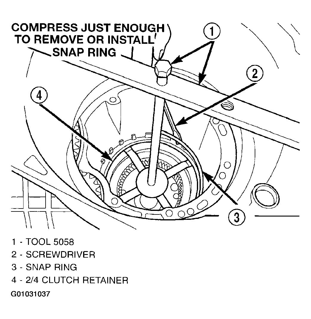 46. Using tool 5058, compress 2/4 clutch return spring just enough to install snap ring. (Fig 54).
