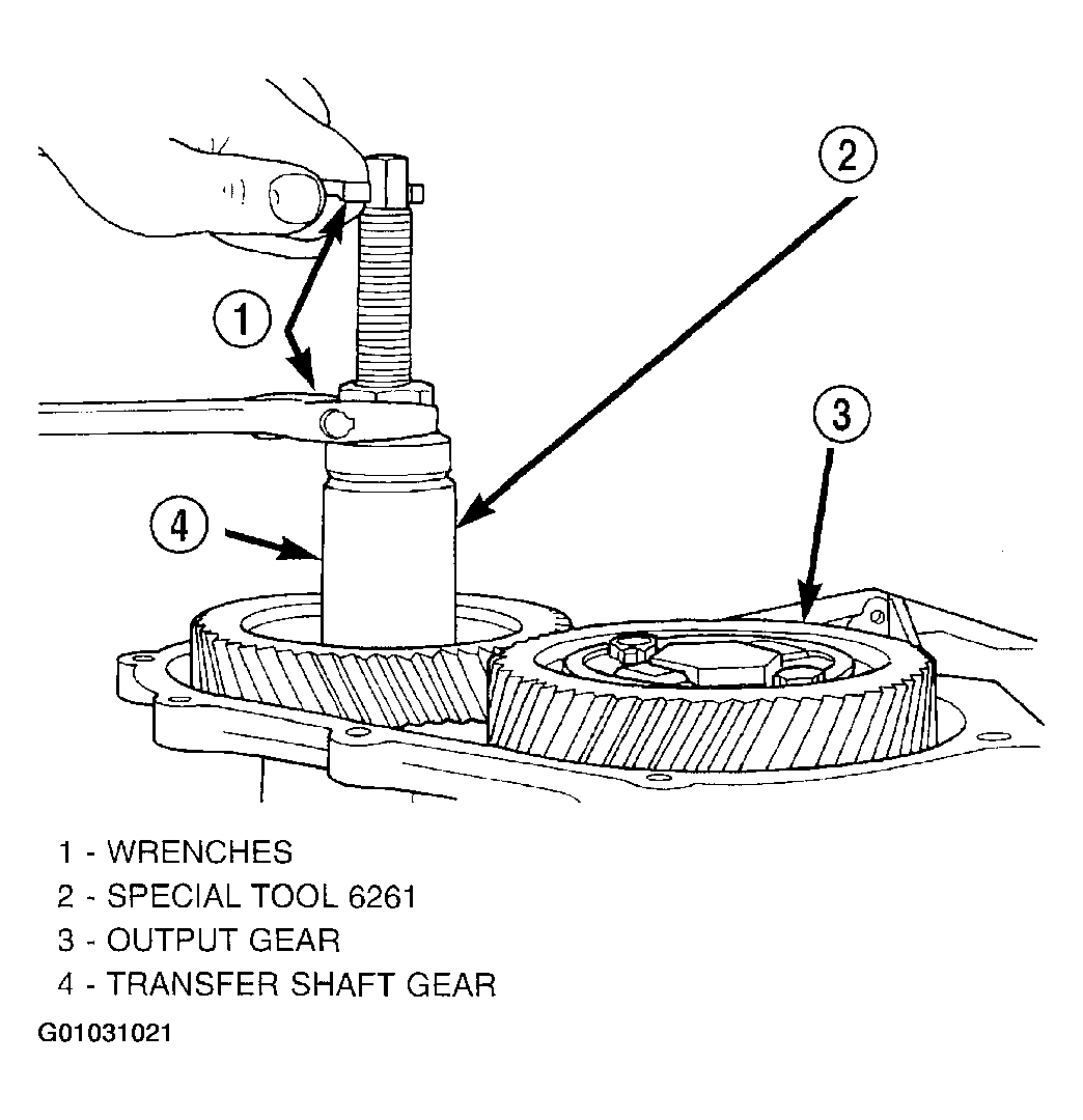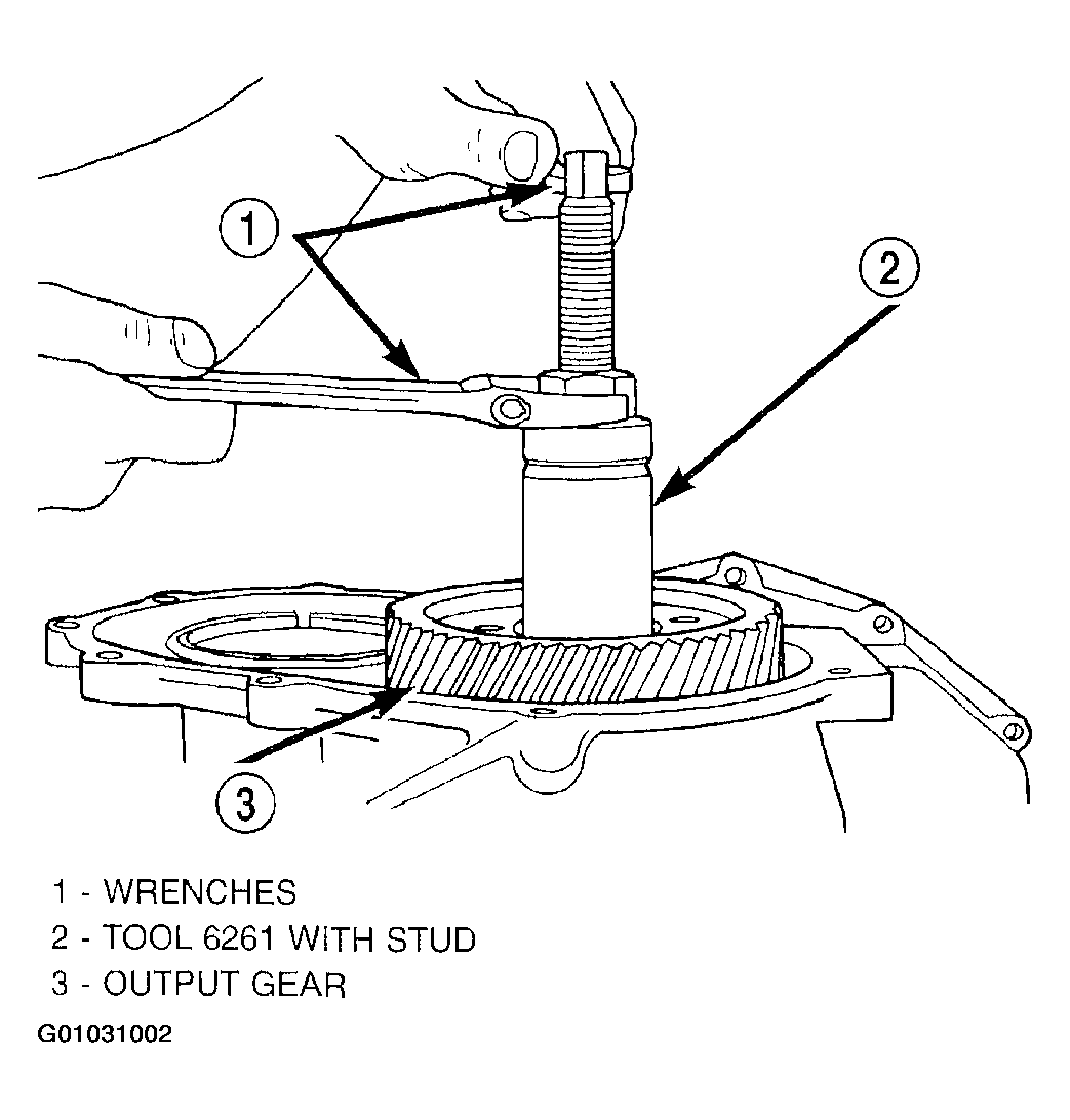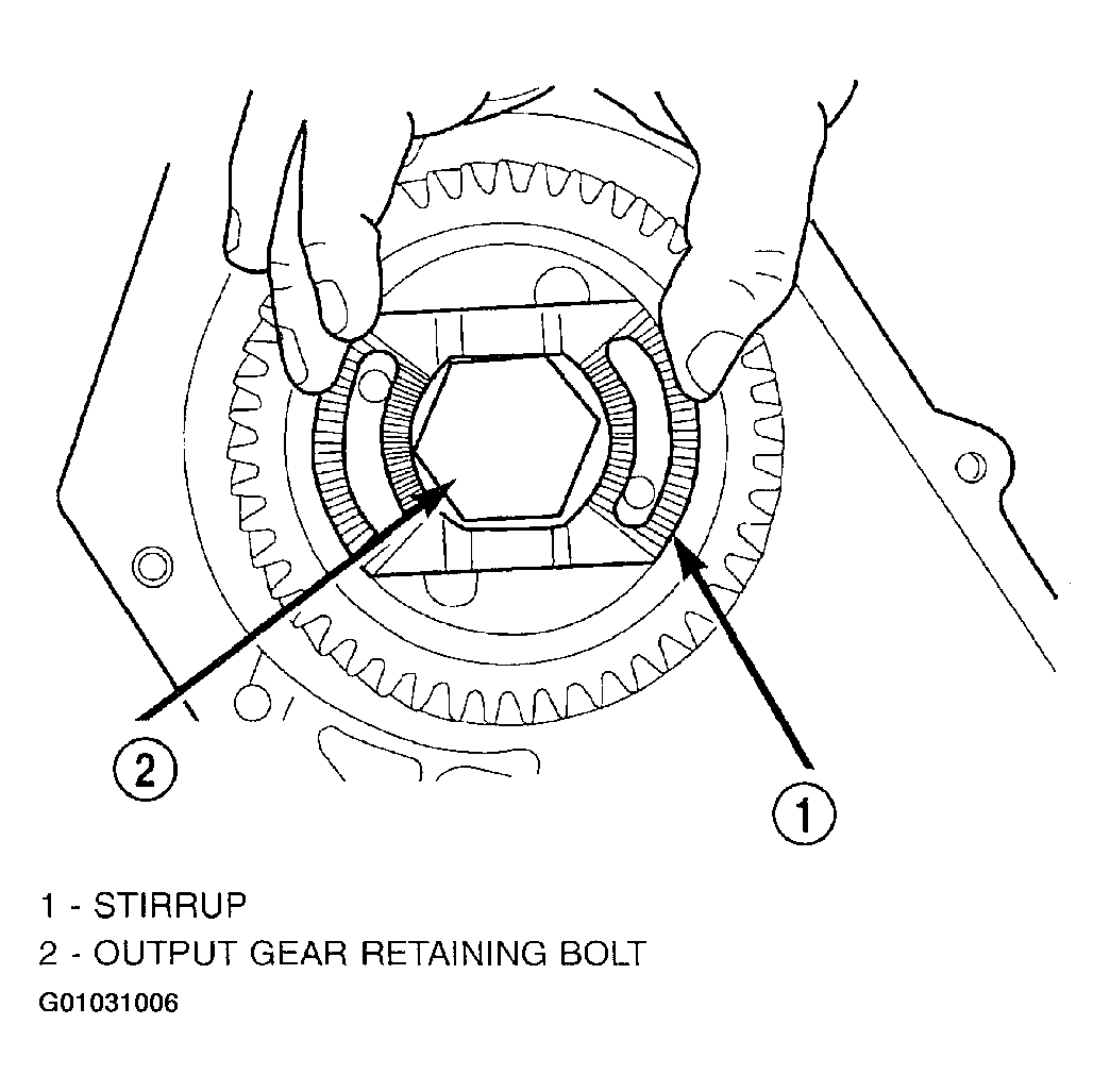 7. Use Tool 6259 to remove the output gear retaining bolt and washer. To remove the output gear, use Tool L4407A.