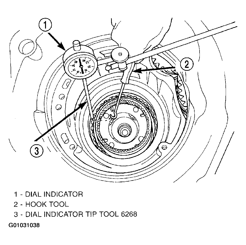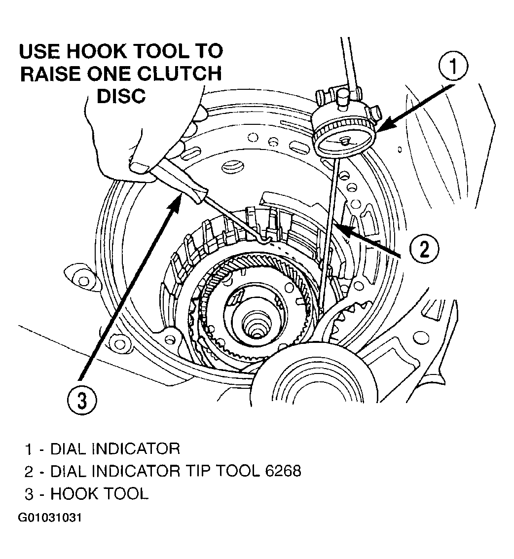48. Set up dial indicator as shown in (Fig 55) and measure 2/4 clutch clearance. Press down on clutch pack with finger and zero dial indicator. 2/4 clutch pack clearance is 0.76-2.64 mm (0.030-0.104 in.)  . Set up indicator and record measurement in four (4) places. Take average of readings. If clearance is outside this range, the clutch is assembled improperly. There is no adjustment for 2/4 clutch clearance  .