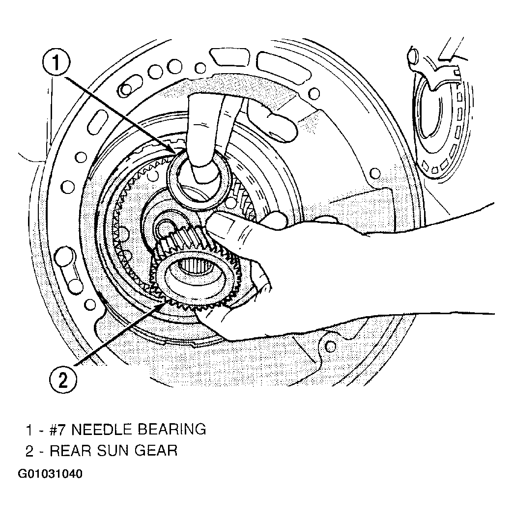 NOTE: The number seven needle bearing has three anti-reversal tabs and is common with the number five and number two position. The orientation should allow the bearing to seat flat against the rear sun gear. (Fig 57). A small amount of petrolatum can be used to hold the bearing to the rear sun gear.