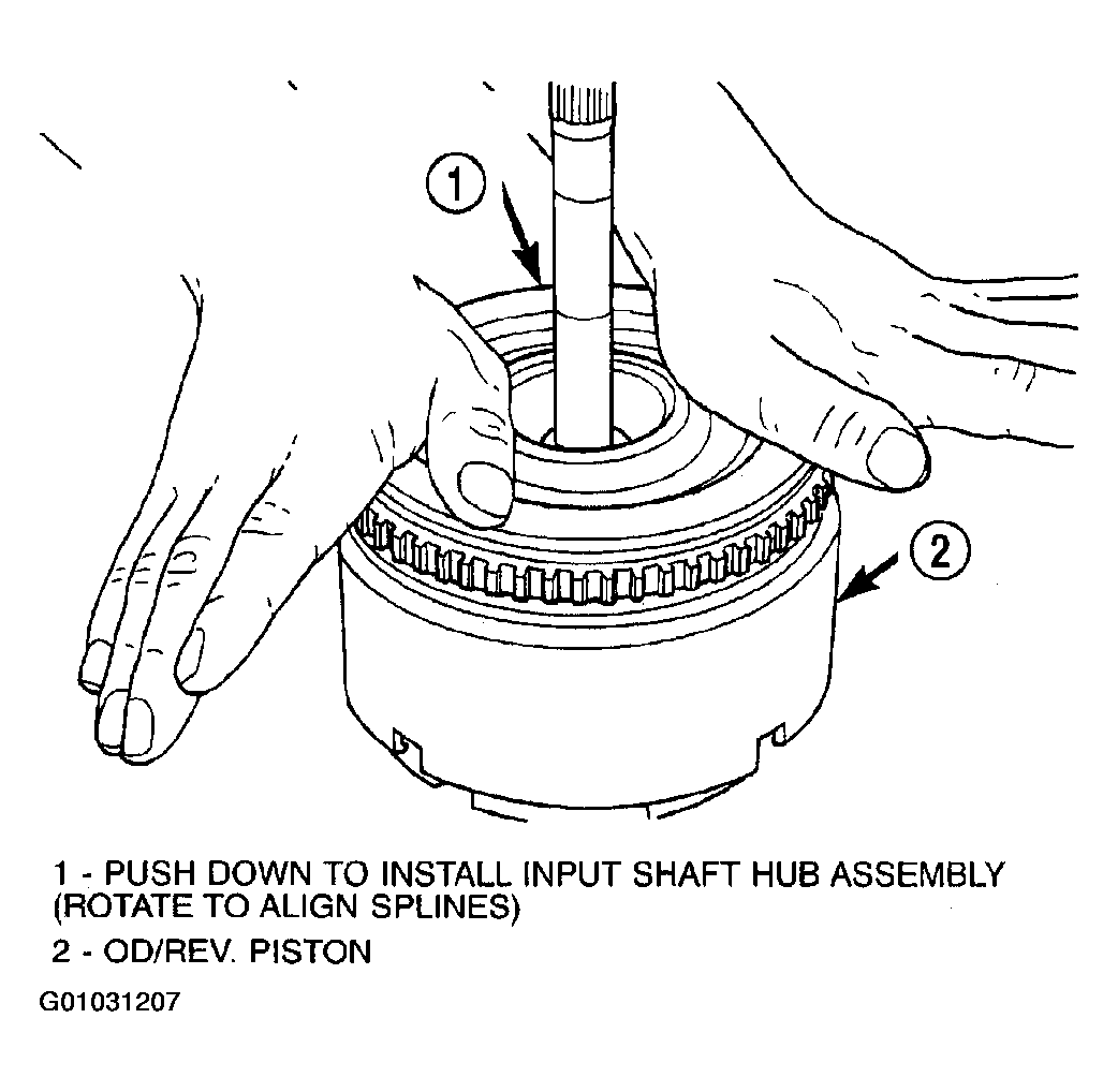 - Install the input hub shaft assembly to the OD/Reverse piston/clutch retainer assembly. (Fig 6).