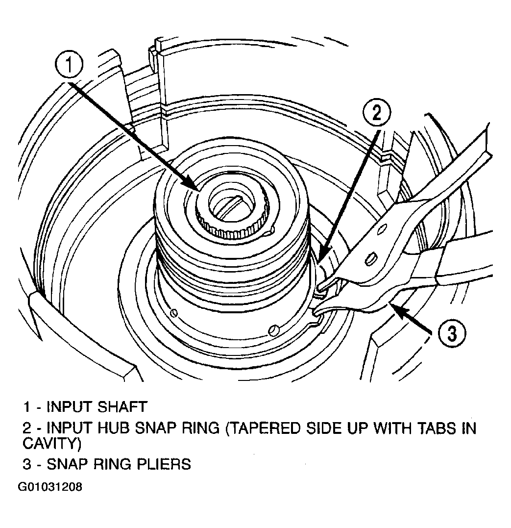NOTE: Snap ring ends must be located within one finger of the input clutch hub. Be sure that snap ring is fully seated, by pushing with screwdriver, into snap ring groove all the way around.