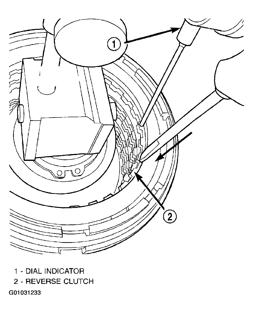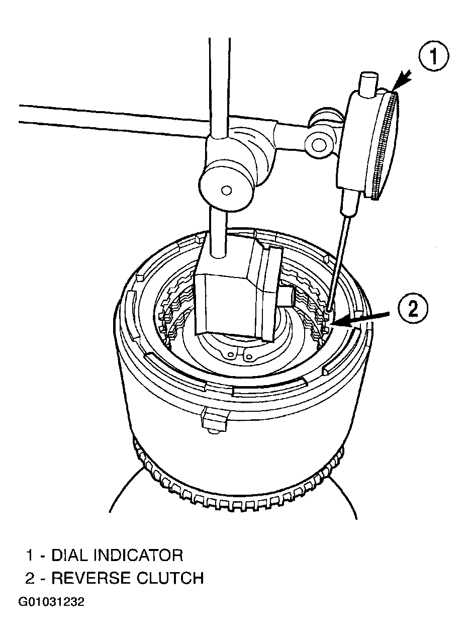 - Set up a dial indicator on the reverse clutch pack as shown in (Fig 31).