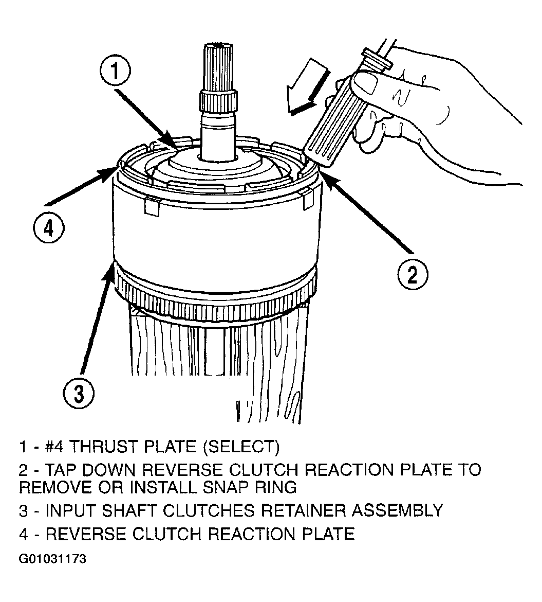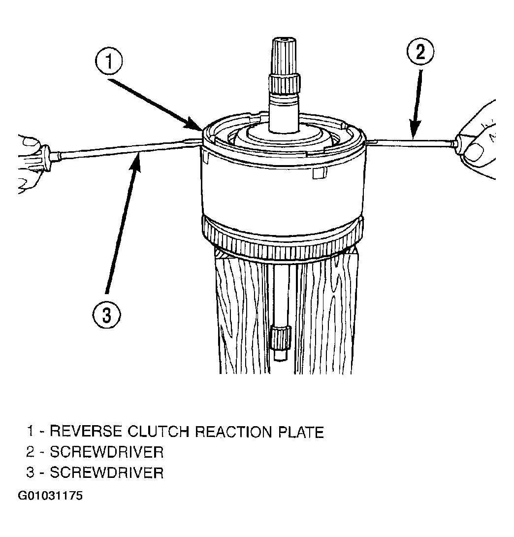 - Tap down reverse clutch reaction plate to release pressure from snap ring. (Fig 1).