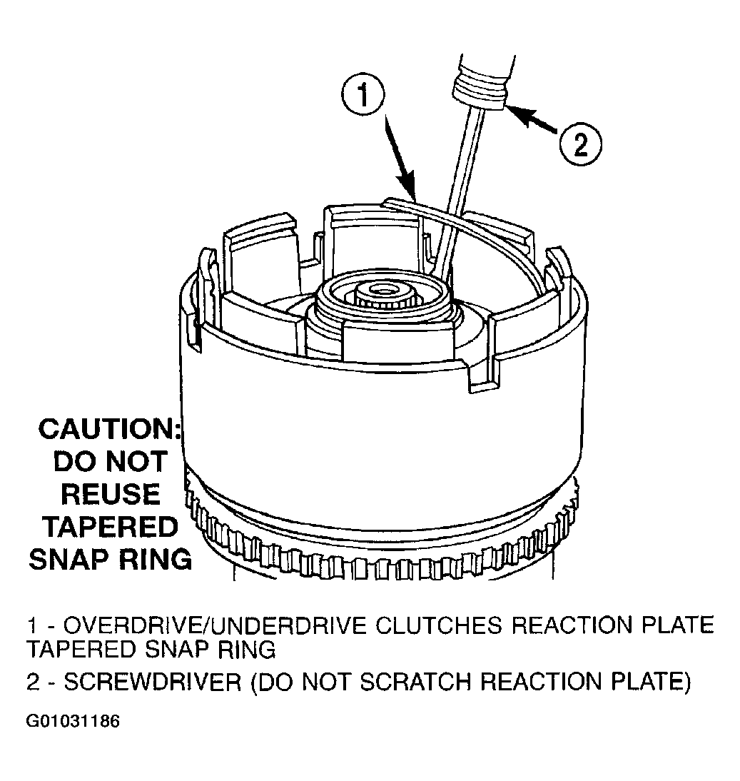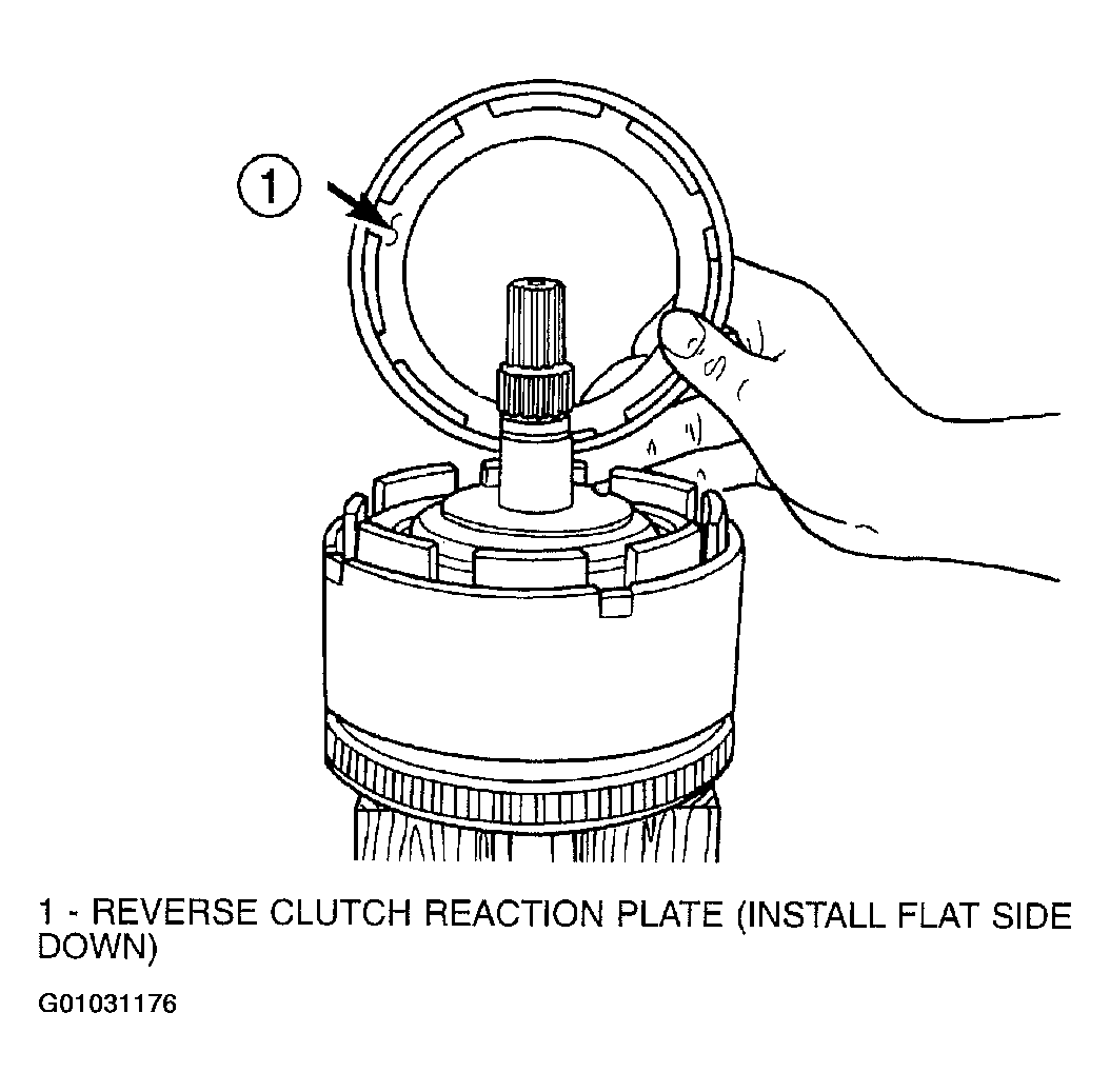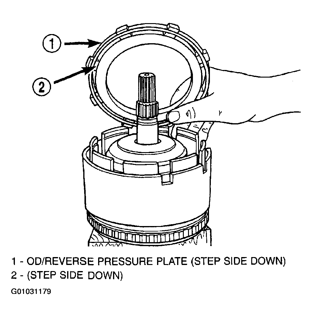 The OD/UD clutch reaction plate has a step on both sides. Install the OD/UD clutches reaction plate tapered step side up.