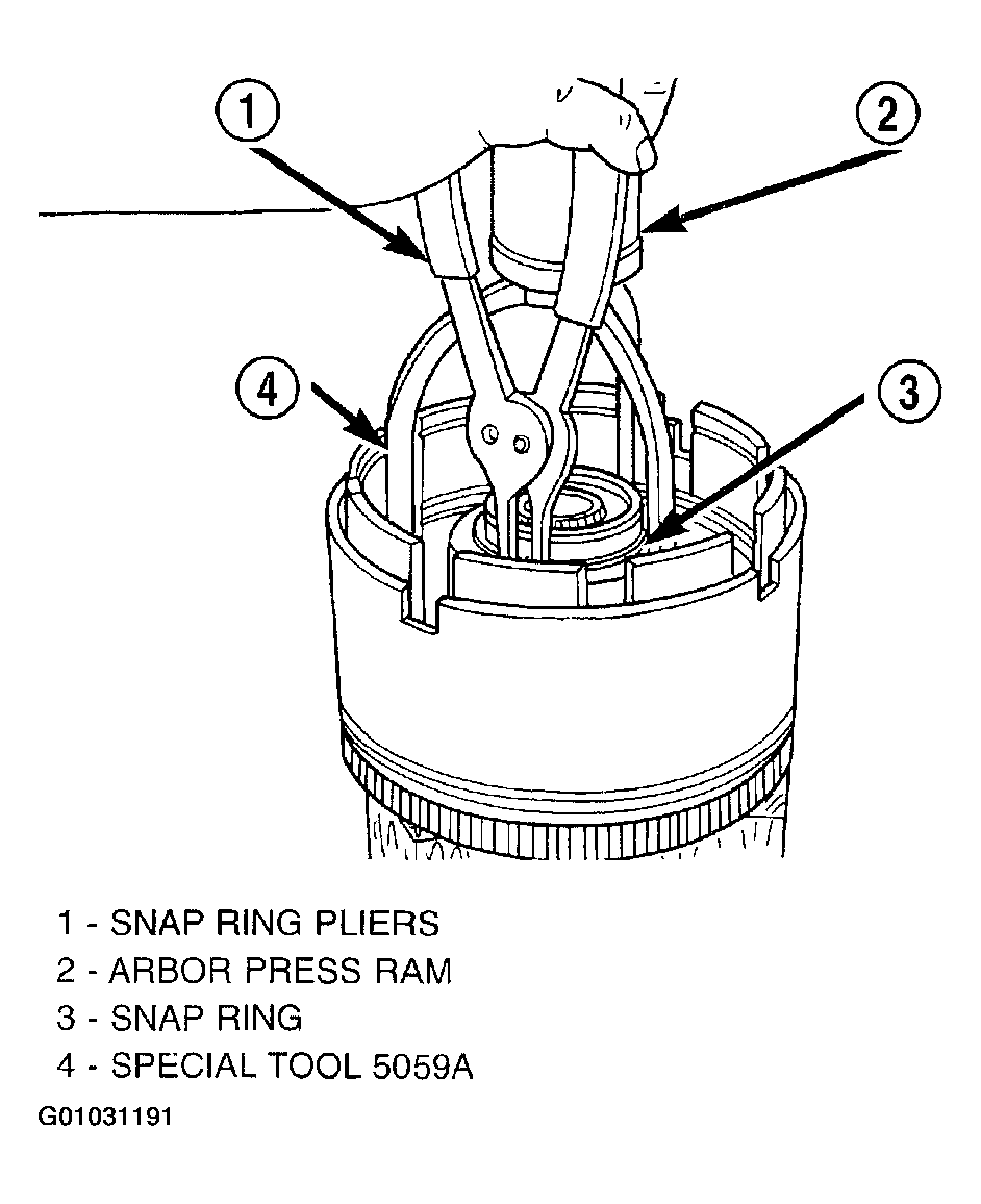 - Using Tool 5059A and an arbor press, compress UD clutch piston enough to remove snap ring. (Fig 19 and Fig 20