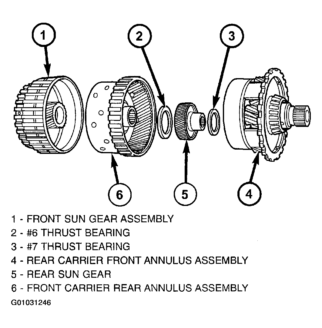 The planetary geartrain is located between the input clutch assembly and the rear of the transaxle case. The planetary geartrain consists of two sun gears, two planetary carriers, two annulus (ring) gears, and one output shaft. (Fig 1).