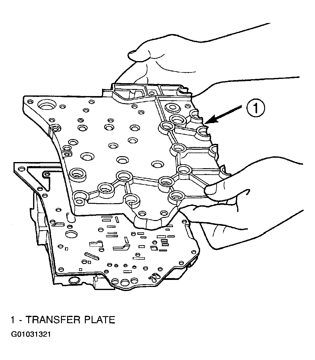- Install transfer plate to valve body and separator plate. Make sure oil screen and #5 check valve do not bind. (Fig 9).