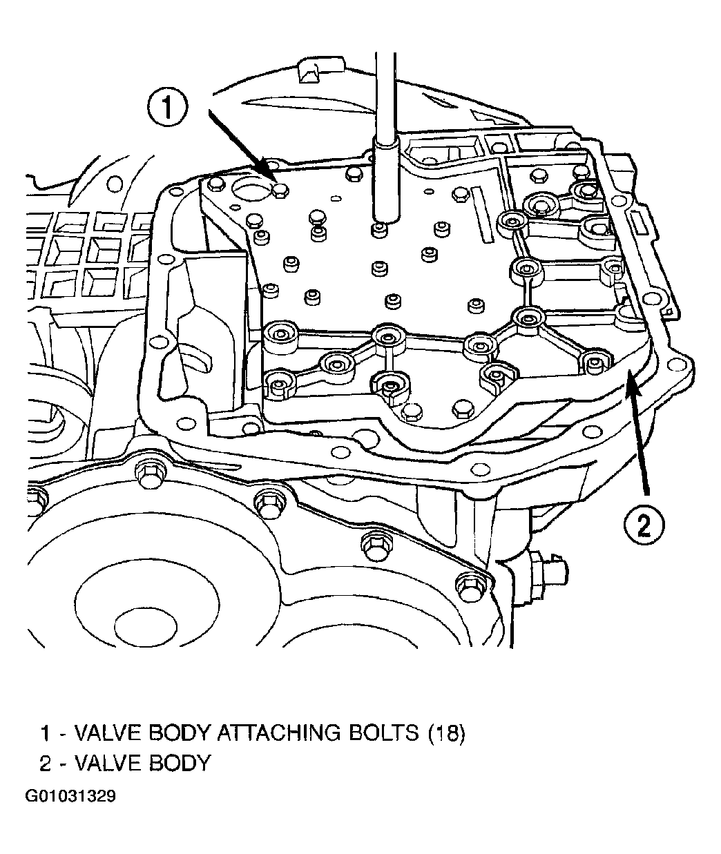 - Install valve body assembly to transaxle. (Fig 1). Install and torque valve body-to-transaxle case bolts to 12 N.m (105 in. lbs.). (Fig 2).