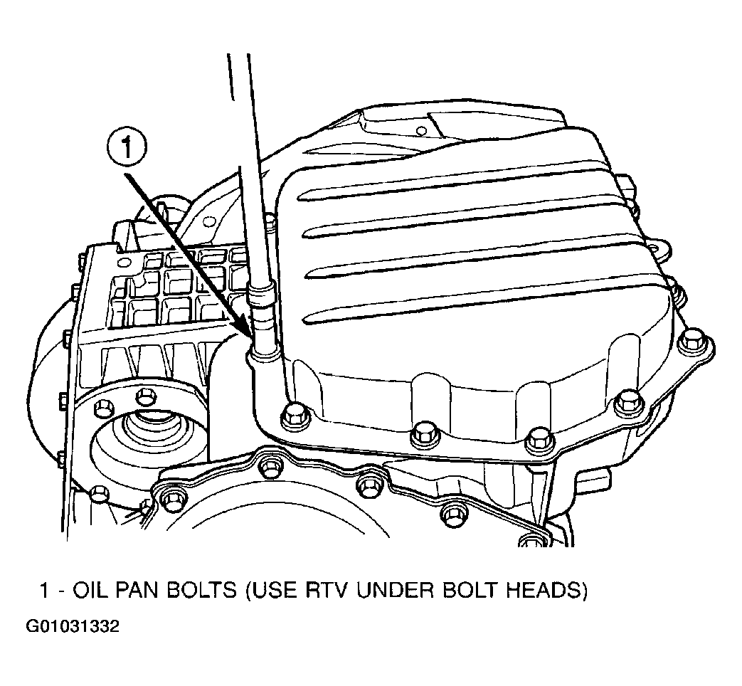 - Ensure the transaxle oil pan and transaxle case sealing surfaces are clean and dry. Install an 1/8" bead of Mopar® ATF RTV (MS-GF41) to the oil pan and install. (Fig 4). Torque oil pan-to-transaxle case bolts to 19 N.m (165 in. lbs.). (Fig 5).