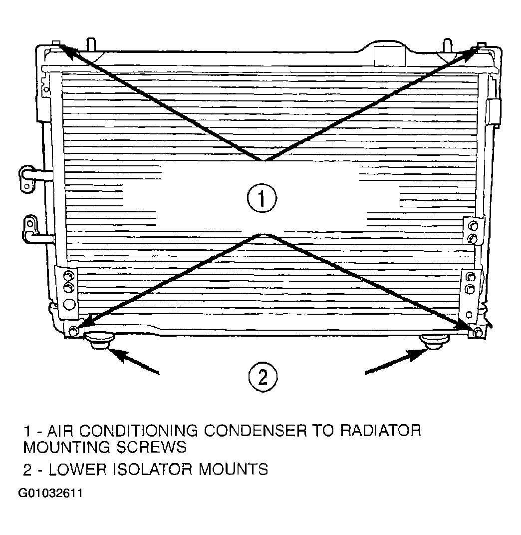 - Attach A/C condenser to radiator (if equipped), with four mounting screws. (Figure). Tighten screws to 7.2 N.m (65 in. lbs.). Then seat the radiator assembly lower rubber isolators into the mounting holes provided in the lower crossmember.