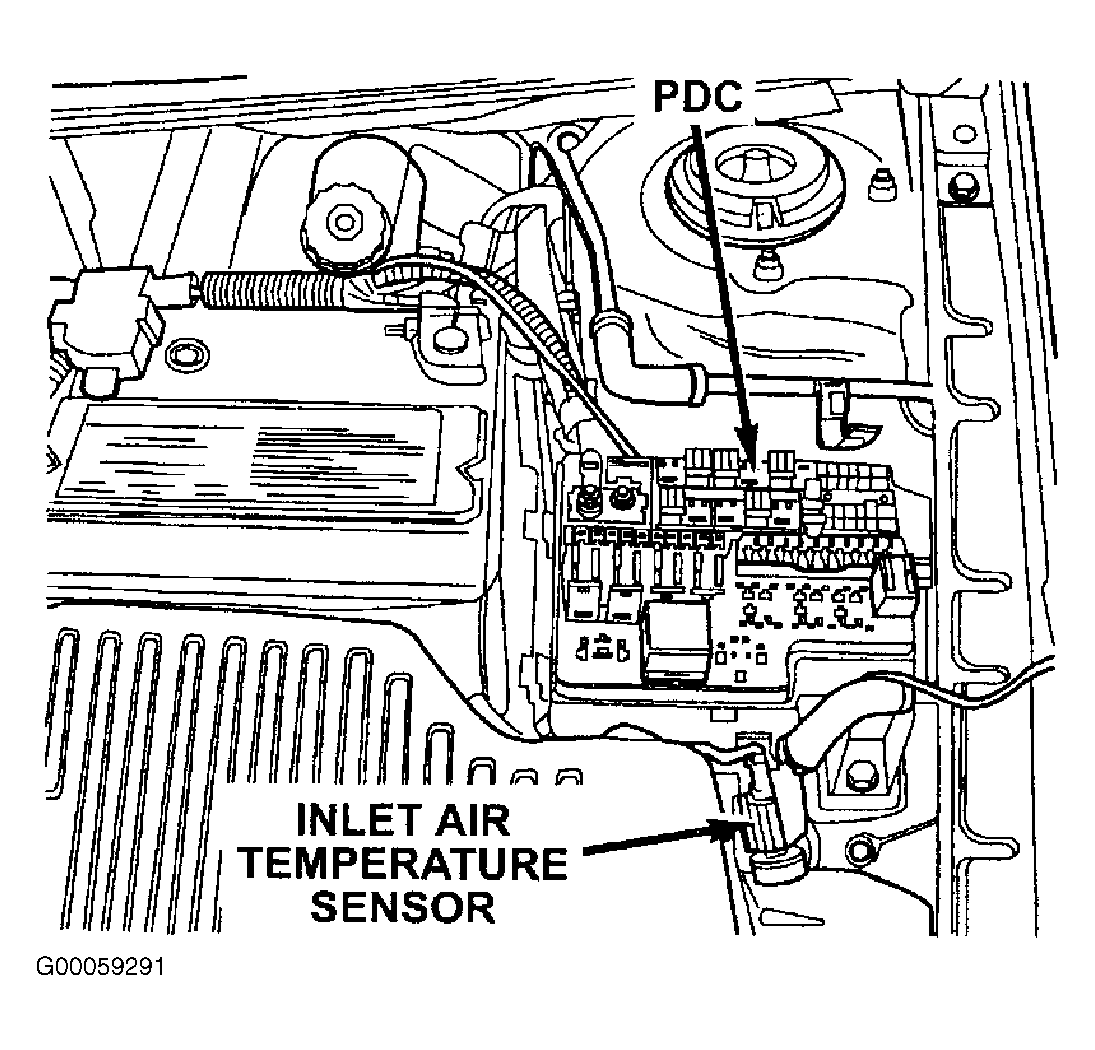 4. Turn ignition off. Remove radiator fan relay from Power Distribution Center (PDC). See Figure . PDC is located in engine compartment. See Figure . Connect a test light between ground and fused battery voltage circuit (Gray wire) at radiator fan relay harness connector terminal No. 73 in PDC. See Figure and Figure . If test light illuminates brightly, go to next step. If test light does not illuminate brightly, repair open or short in fused battery voltage circuit.
