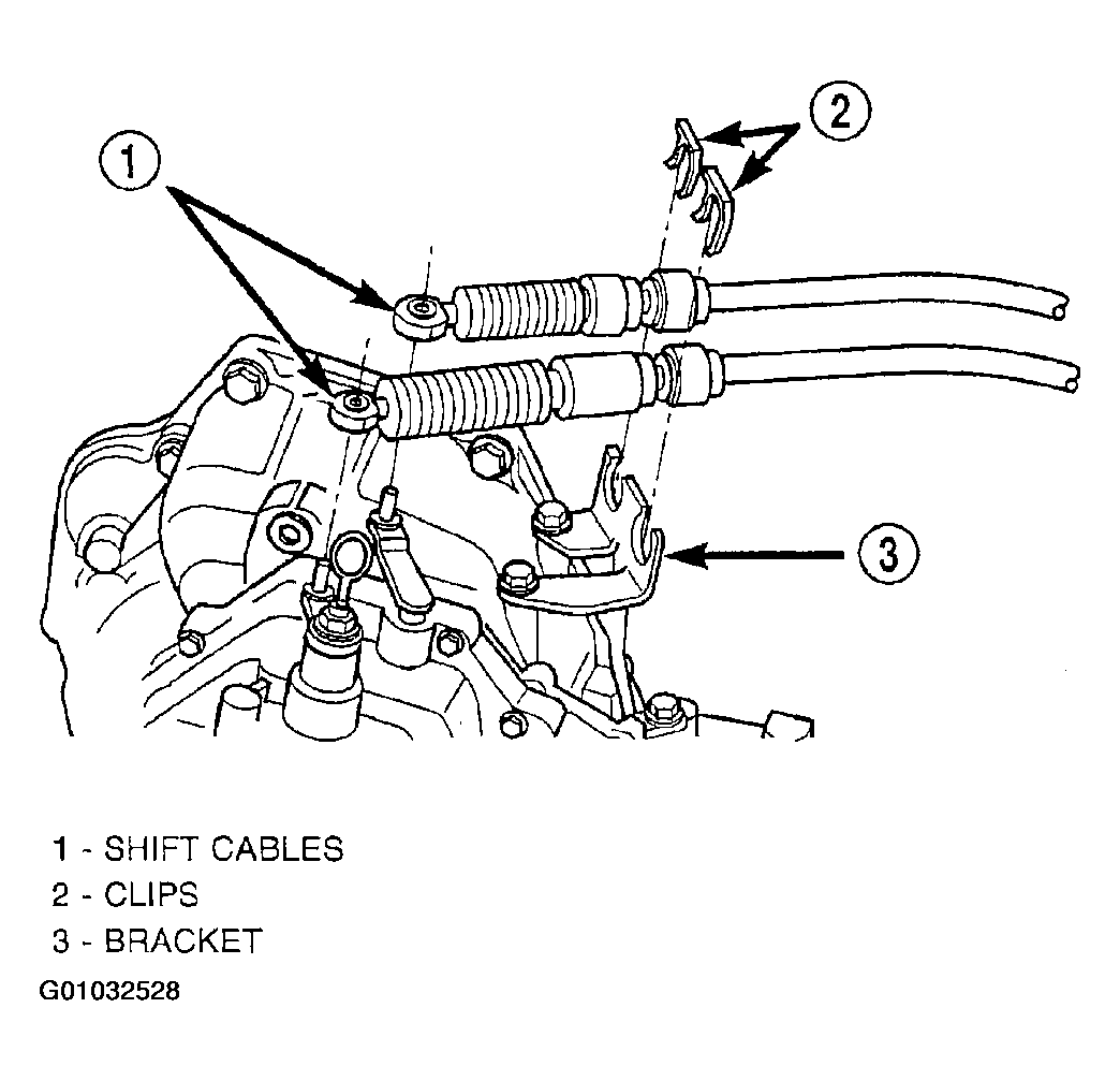- Connect shift crossover and selector cables to shift lever. Install cables to bracket and install retaining clips. (Figure).