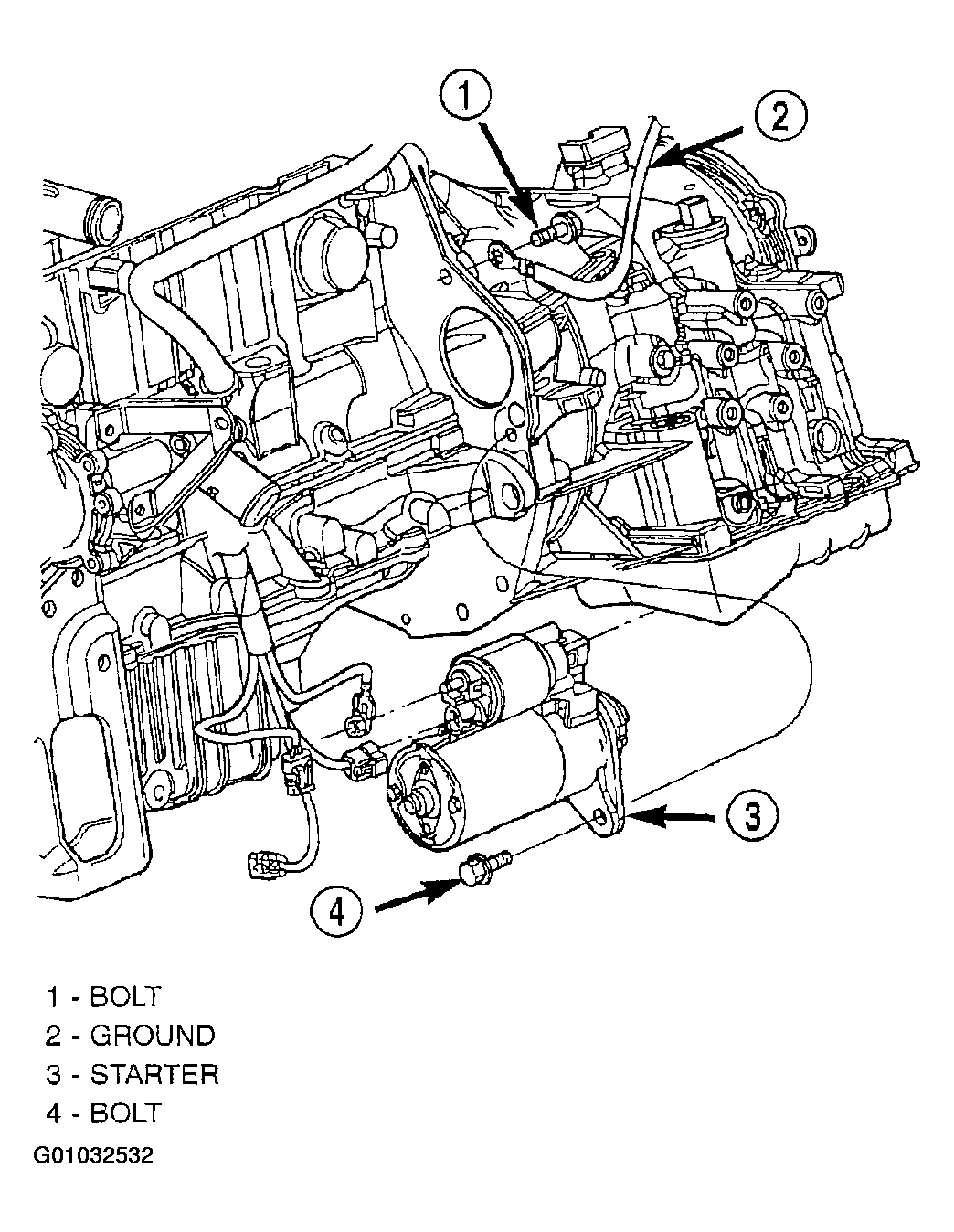 - Install starter motor and tighten bolts to 54 N.m (40 ft. lbs.). Make sure to fasten ground cable to upper starter bolt as shown in. (Figure).