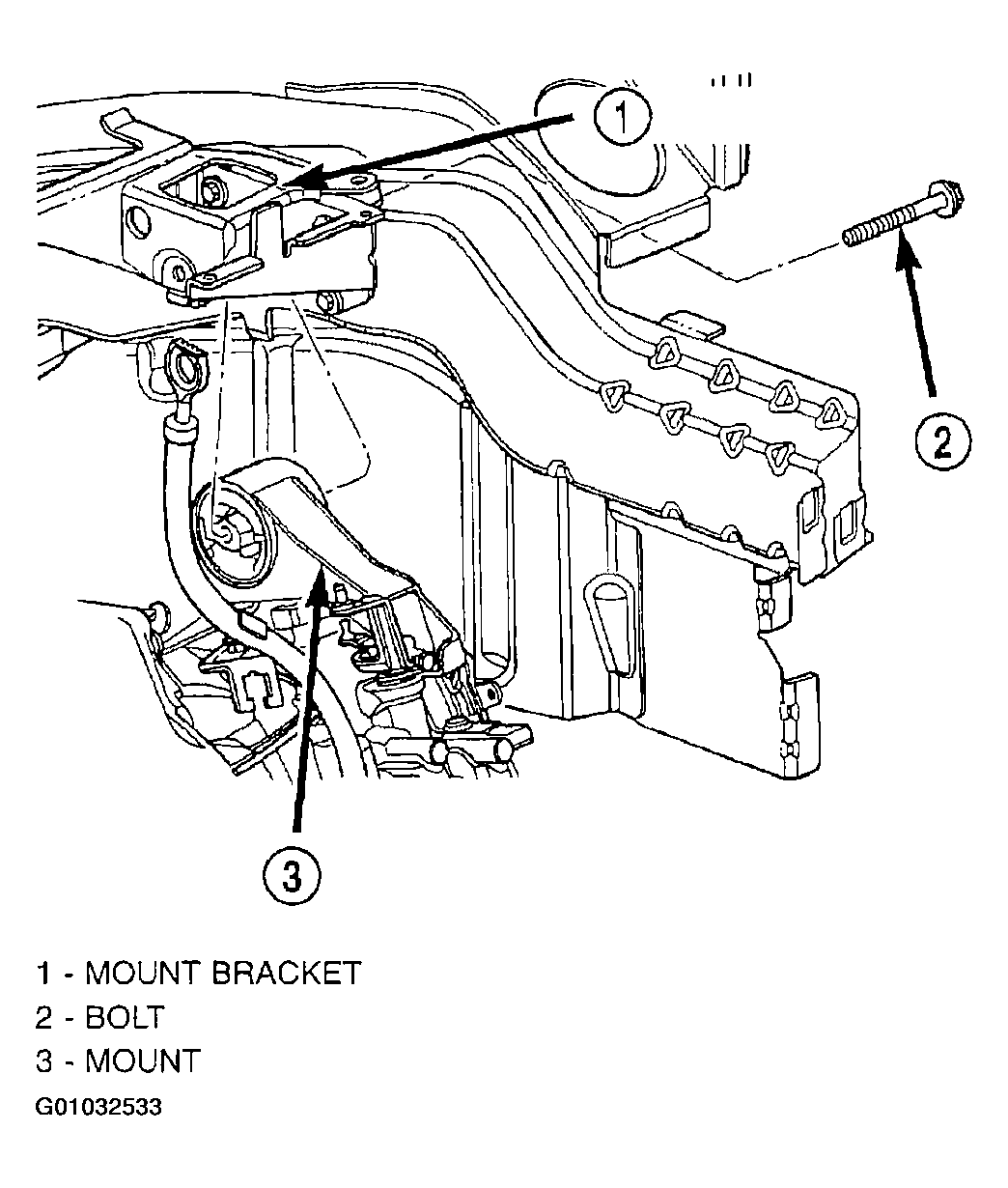 - Raise engine and transaxle with screw jack until through hole in upper mount aligns with hole in mount bracket. Install mount bolt and tighten to 108 N.m (70 ft. lbs.). (Figure).