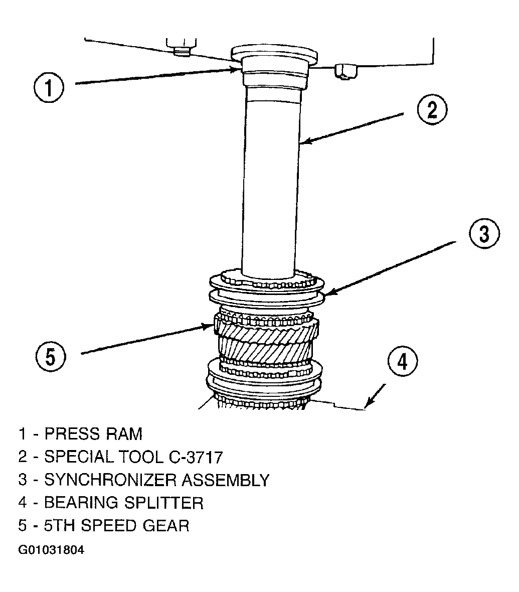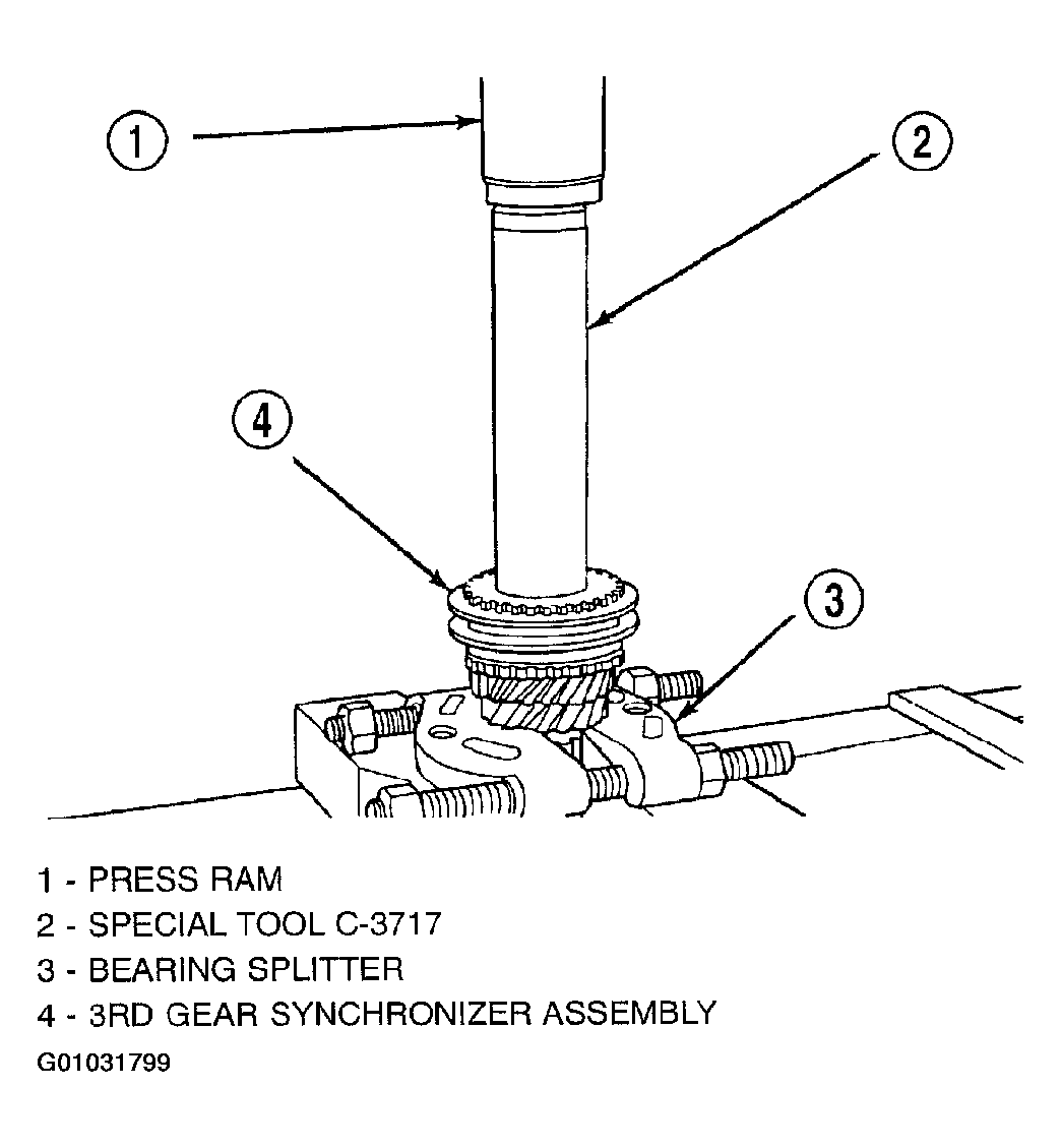 - Install 3rd gear and 3-4 synchronizer onto input shaft. Install Tool #C-3717 over input shaft and press on synchronizer hub and 3rd gear. (Fig 2). The synchronizer hub has the letter "U" stamped on the top face of the hub. This designates that the hub must be installed with the U facing upward.