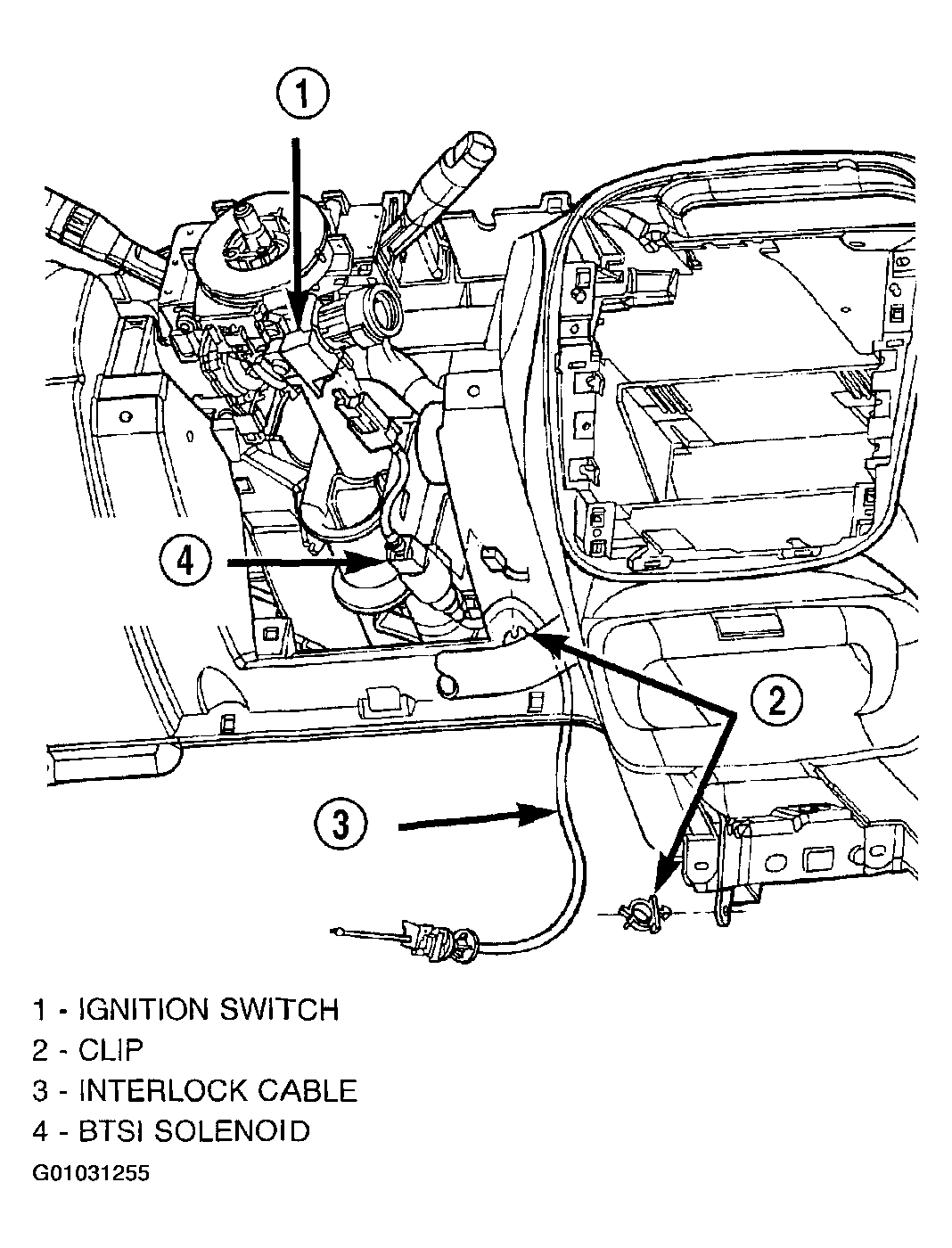 - Install the interlock cable into the interlock housing at the steering column (Figure). Verify the cable snaps into the housing and is fully seated.