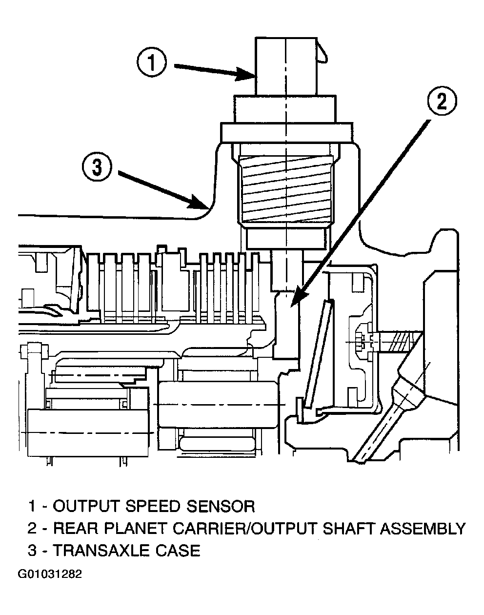 The Output Speed Sensor provides information on how fast the output shaft is rotating. As the rear planetary carrier park pawl lugs pass by the sensor coil (Fig 1), an AC voltage is generated and sent to the TCM. The TCM interprets this information as output shaft RPM.