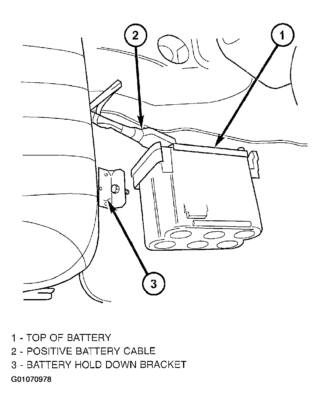 - Disconnect and isolate the battery positive cable. Note the position of the battery positive cable for installation reference (Fig 2 ).