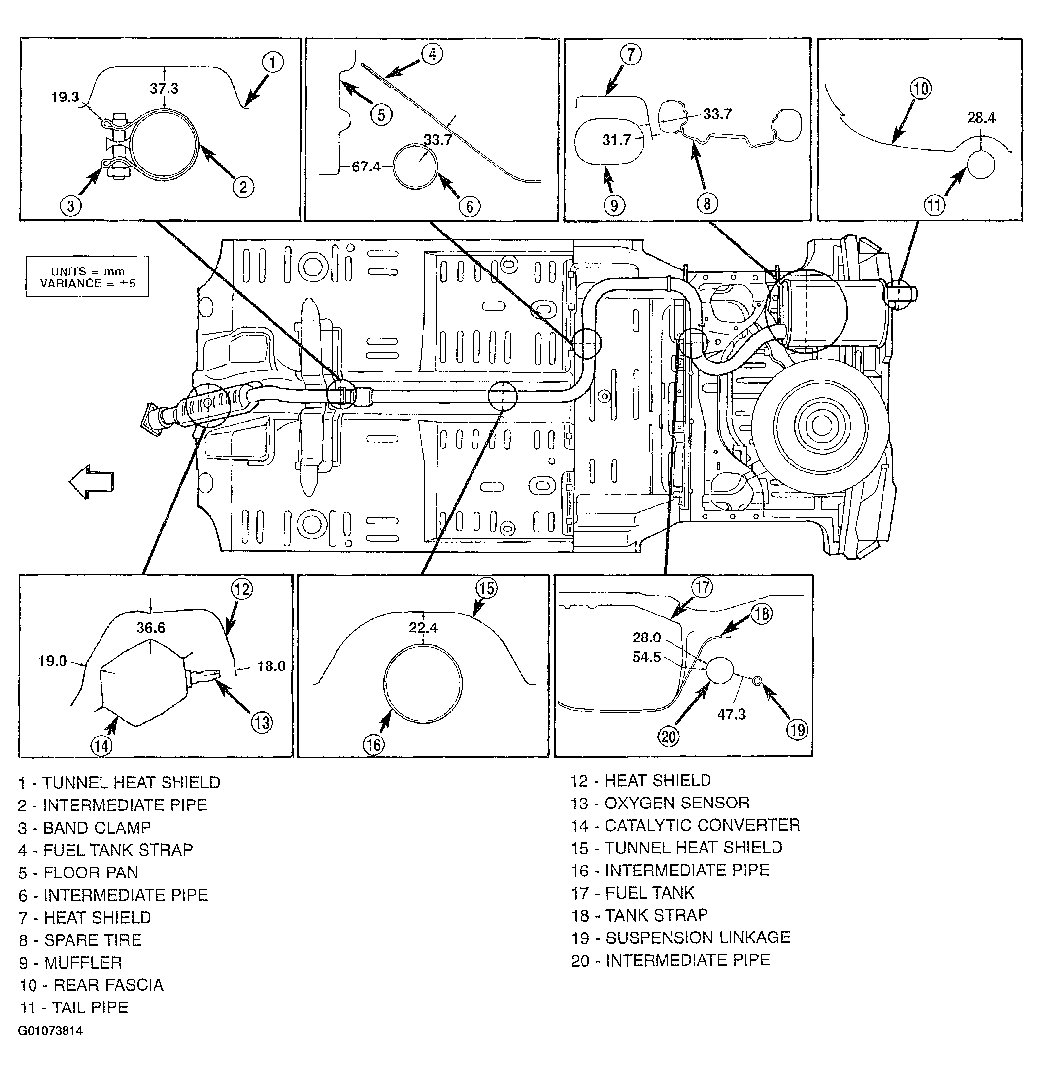 - Working from the front of system; align each component to maintain position and proper clearance with underbody parts. See Figure . For clearance specifications, see SPECIFICATIONS .