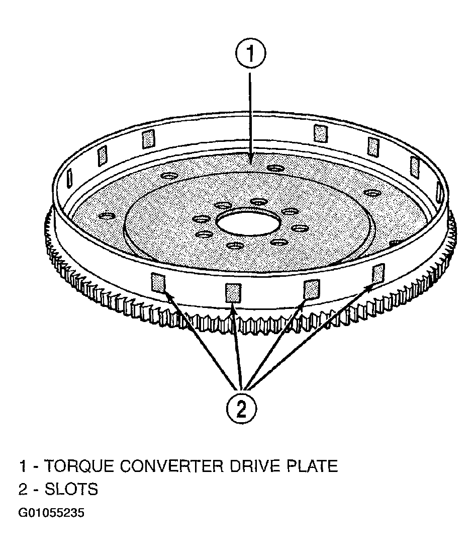 The crankshaft position sensor detects slots cut into the transmission driveplate extension. There are 3 sets of slots. Two sets contain 4 slots and one set contains 5 slots, for a total of 13 slots (Fig 1). Basic timing is set by the position of the last slot in each group. Once the Powertrain Control Module (PCM) senses the last slot, it determines which piston will be next at TDC from the camshaft position sensor input. It may take the PCM one engine revolution to determine crankshaft position.