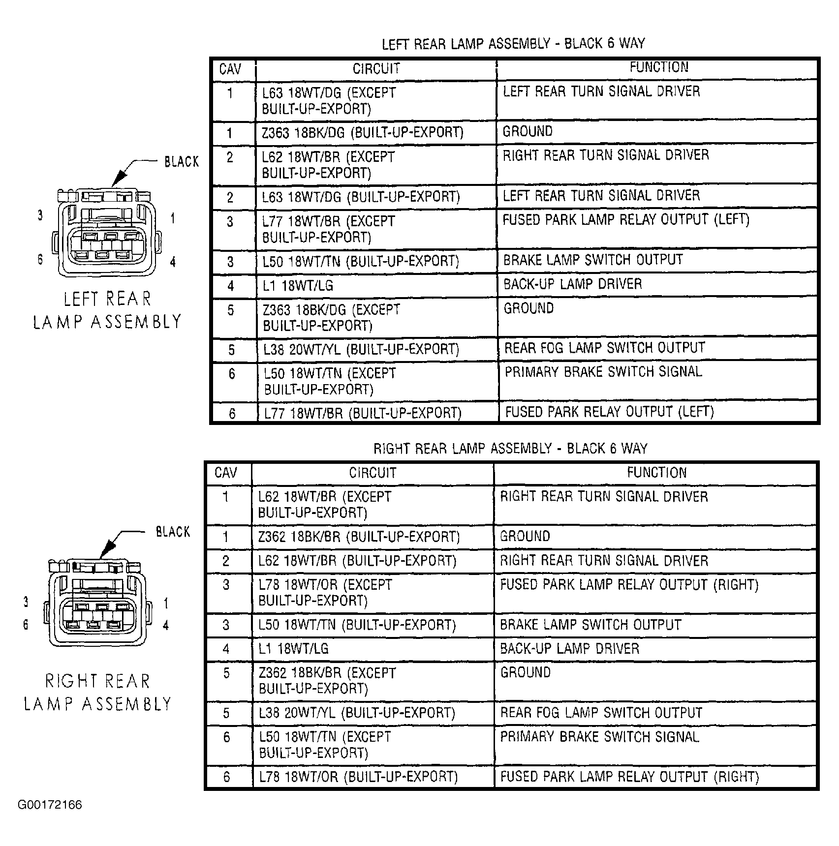 4. Turn the ignition off. Disconnect the Body Control Module harness connector. See Figure. Disconnect the inoperative rear tail lamp harness connector. See Fig 1. Measure the resistance of the Backup Lamp Driver Circuit. If the resistance is above 5 ohms, repair the Backup Lamp Driver Circuit for an open condition. If the resistance is below 5 ohms, replace the Body Control Module. See BODY CONTROL MODULE  under REMOVAL & INSTALLATION.