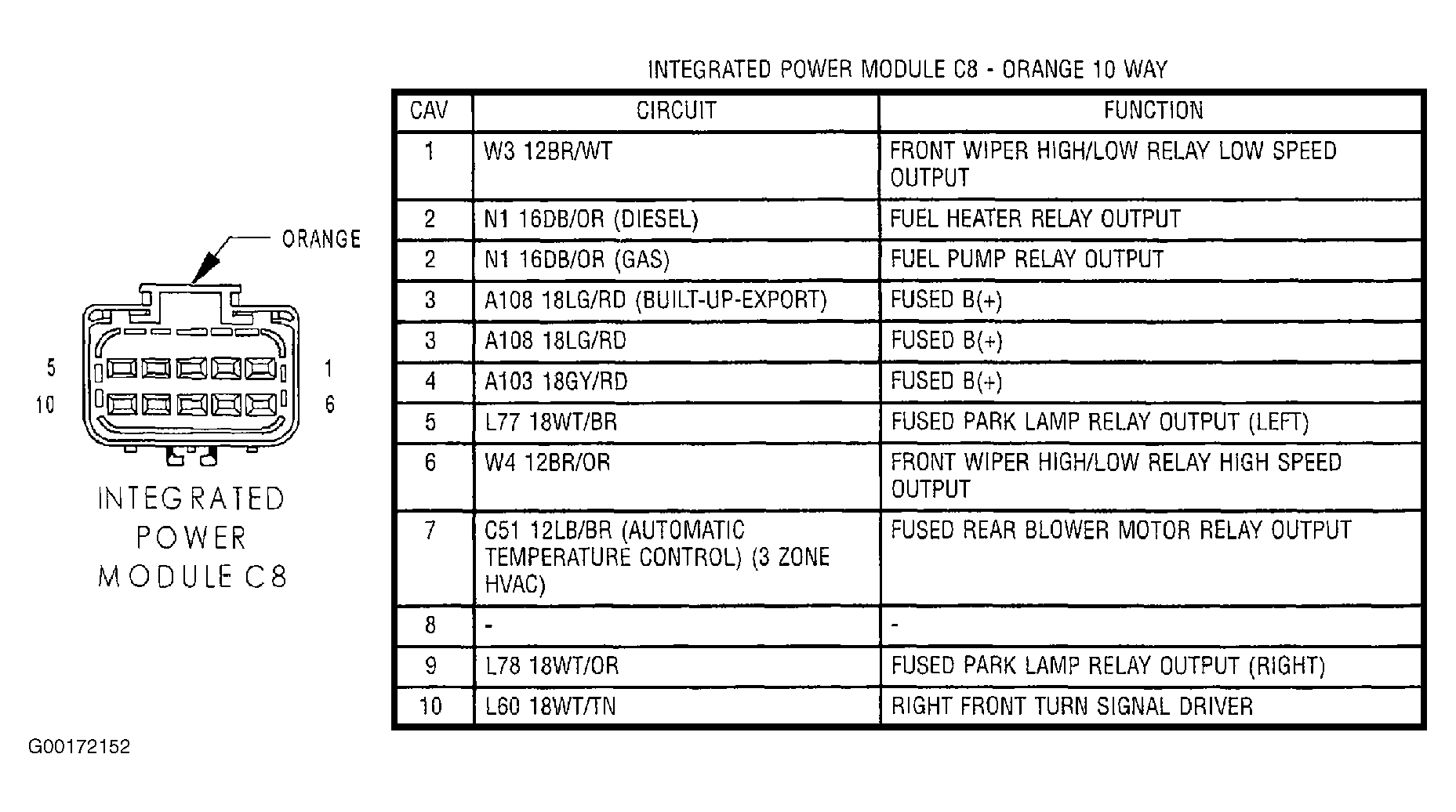 5. Turn the ignition off. Disconnect the Body Control Module C2 harness connector. See Figure. Disconnect the IPM C8 harness connector. See Figure. Measure the resistance of the Right Front Turn Signal Driver Circuit and ground. If the resistance is below 5 ohms, replace the Body Control Module. See BODY CONTROL MODULE  under REMOVAL & INSTALLATION. If the resistance is above 5 ohms, replace the Intelligent Power Module.