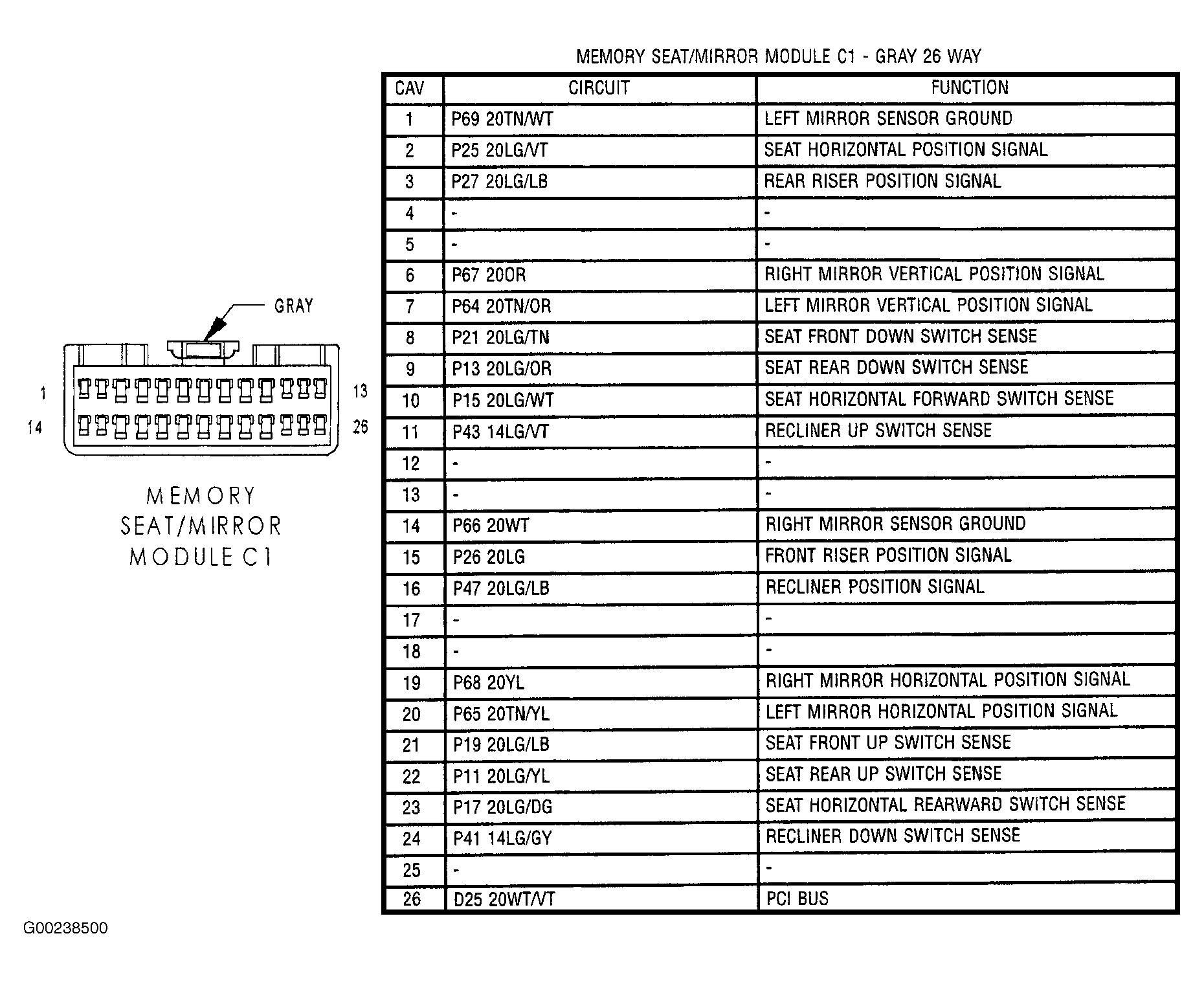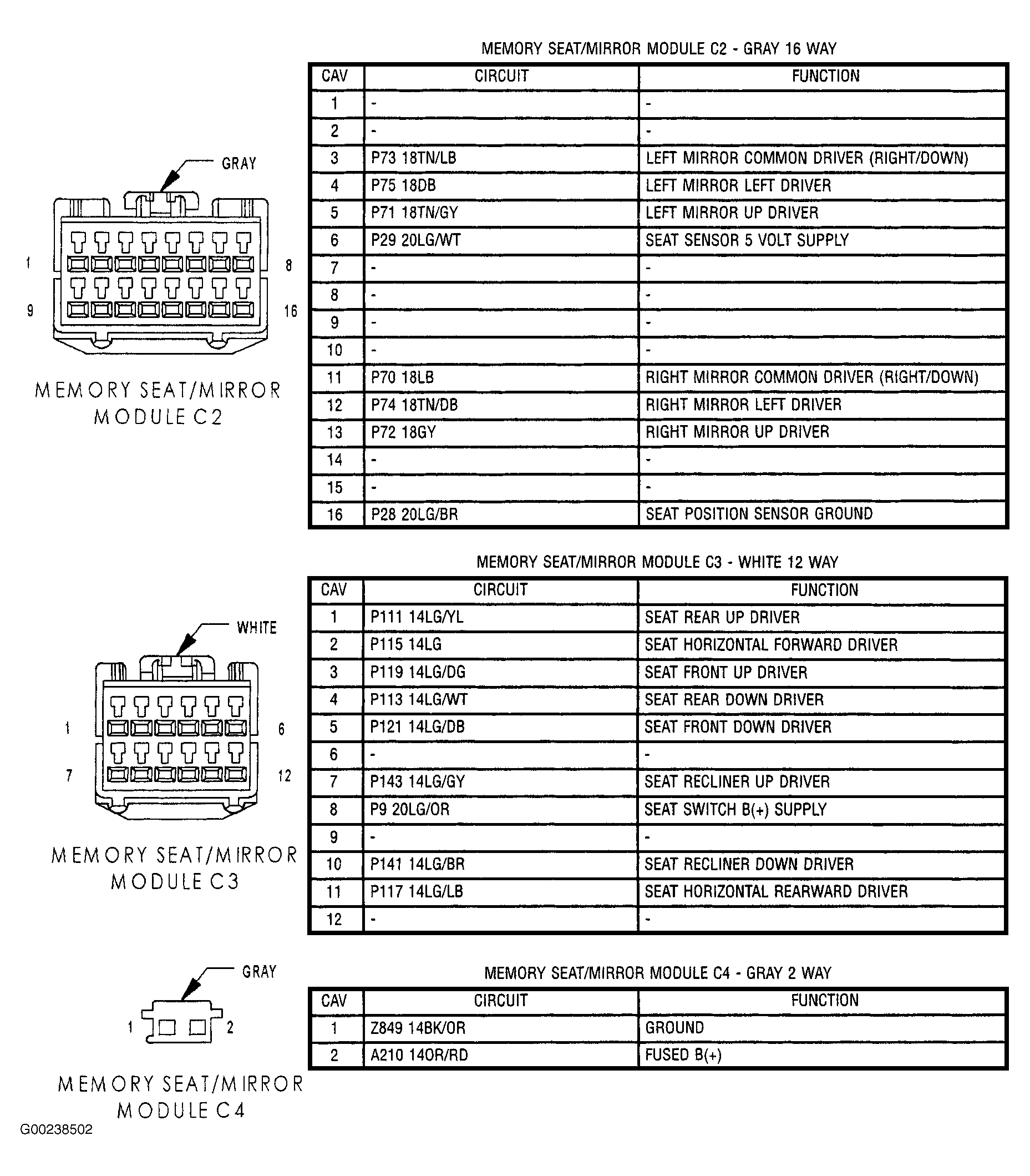 - Turn ignition off. Locate and disconnect MSMM connectors. See COMPONENT LOCATIONS . Ensure driver's seat horizontal position sensor 3-pin connector is disconnected. Using DVOM, measure resistance of Light Green/Brown wire between driver's seat horizontal position sensor 3-pin connector terminal "C" and MSMM connector C3 terminal No. 16. See Figure and Figure . If resistance is greater than 5 ohms, repair open in Light Green/Brown wire. If resistance is 5 ohms or less, replace MSMM. See MEMORY SEAT/MIRROR MODULE under REMOVAL & INSTALLATION.