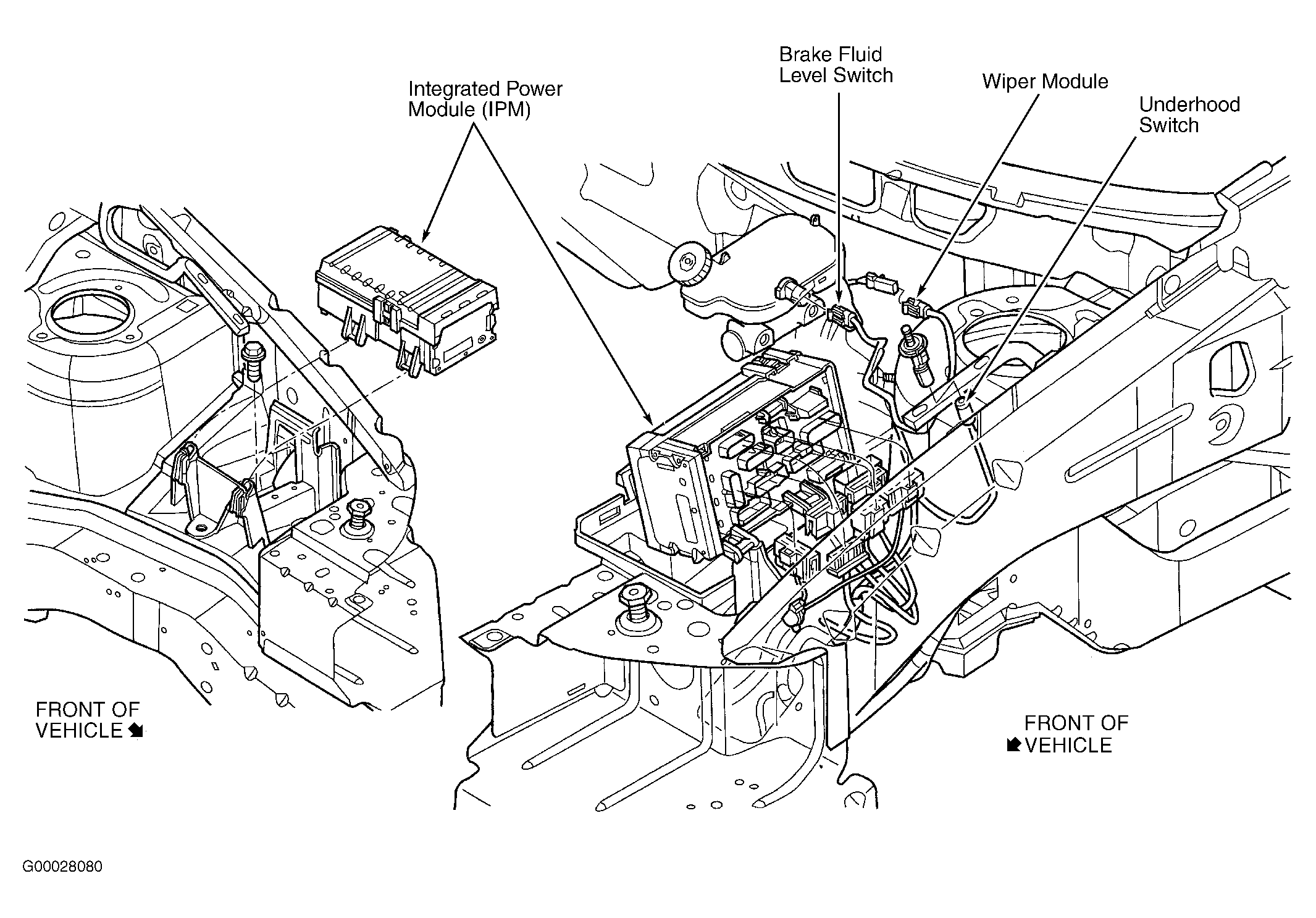 | Wiper Module | Left rear of engine compartment. See Figure. |