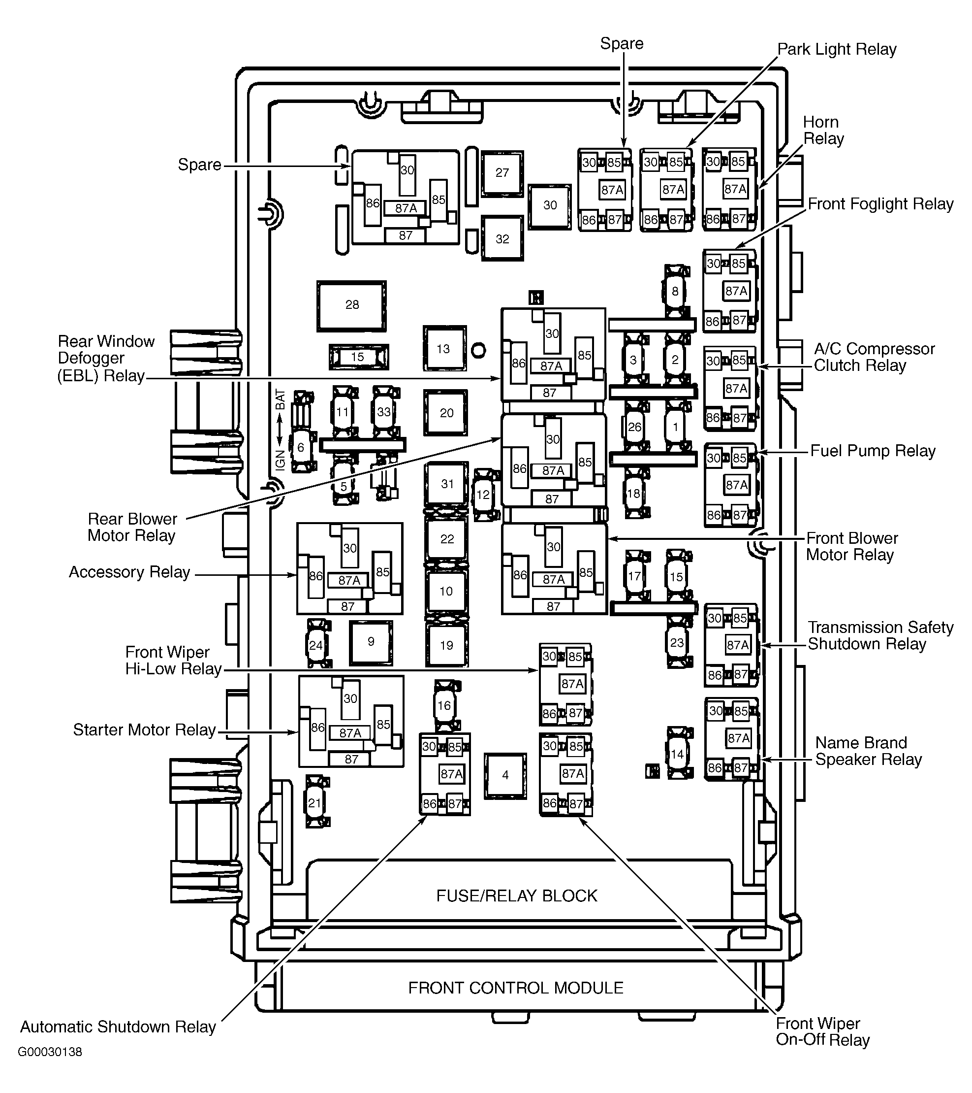 2. Turn ignition off. Remove accessory relay from Intelligent Power Module (IPM) located in left front corner of engine compartment. See Figure. Replace accessory relay with a known-good relay. Turn ignition on. Using scan tool, erase FCM DTCs. Turn ignition off. Wait 10 seconds. Turn ignition on. Recheck for DTCs. If both ACCESSORY POWER OUTPUT OPEN DTCs are set, replace IPM. If both ACCESSORY POWER OUTPUT OPEN DTCs are not set, replace accessory relay.