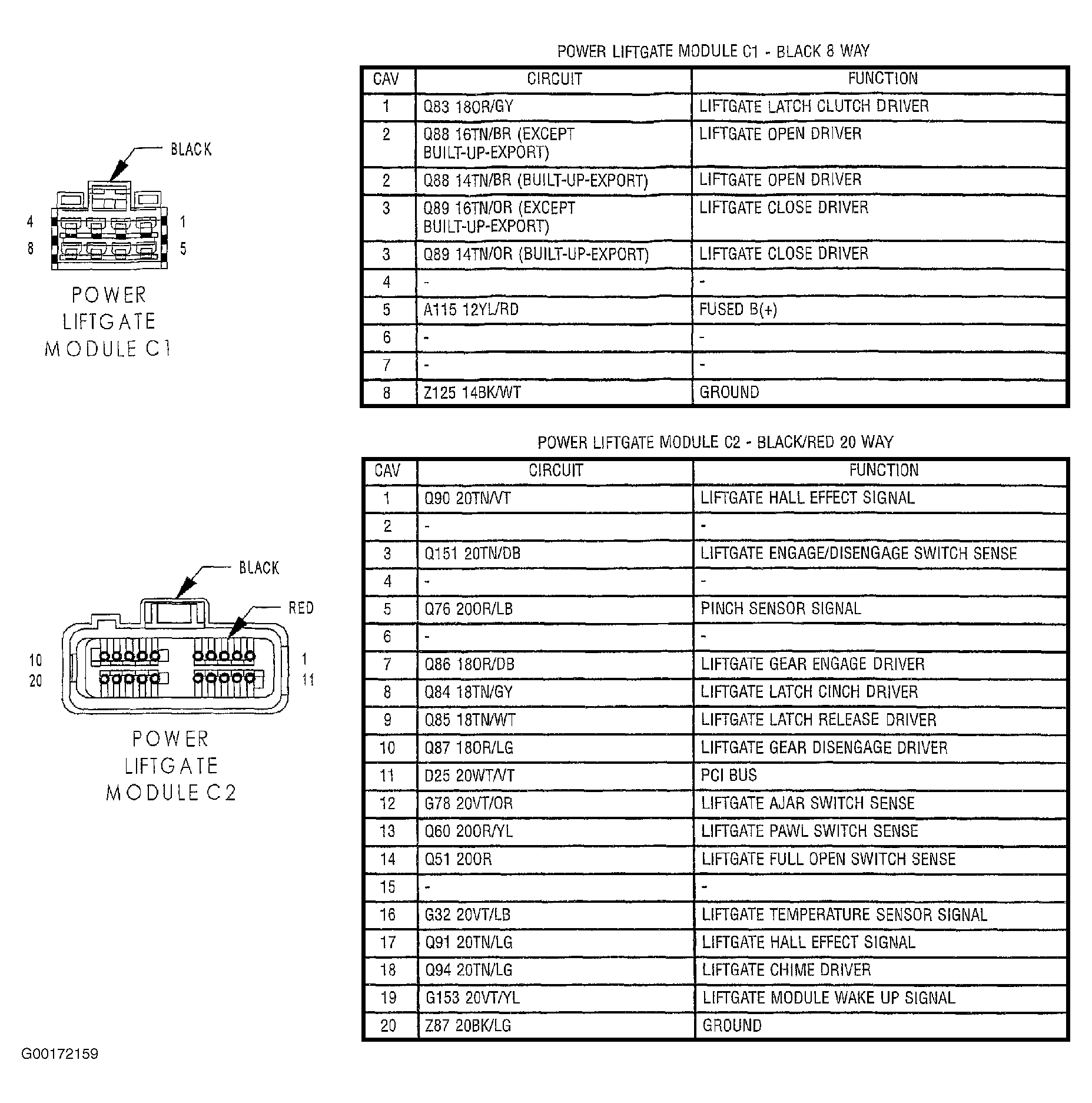 3. Turn the ignition off. Disconnect the Power Liftgate Module C1 connector. See Figure. Using a 12-volt test light connected to 12-volts, check the ground circuit. Wiggle the harness and check for an intermittent open condition. If the test light illuminates brightly, go to the next step. If the test light does not illuminate brightly, repair the Ground circuit for an open.