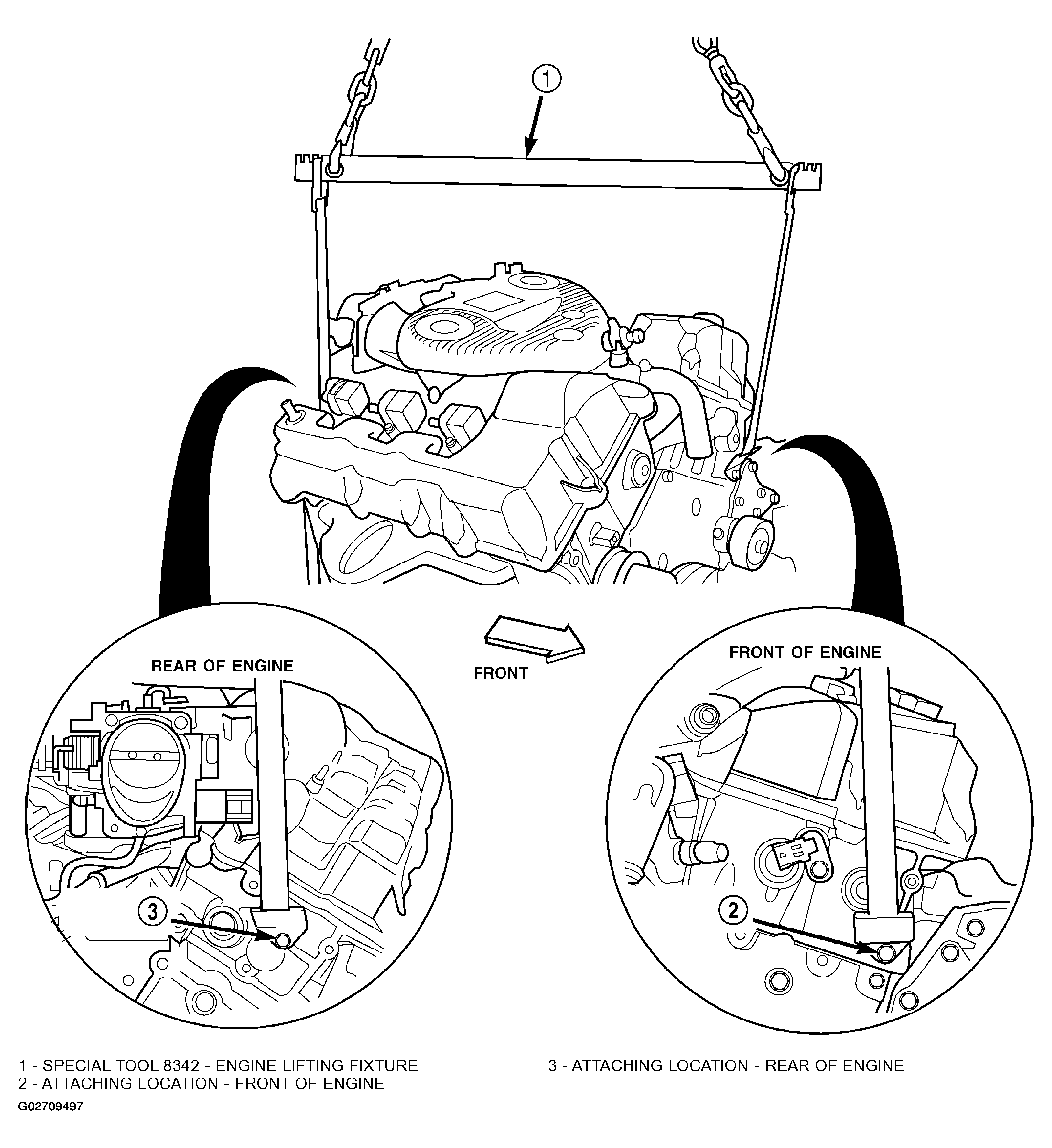 - Attach Special Tool 8342, Engine Lifting Fixture to engine (Figure). Lower engine into engine compartment.CAUTION: Do not tighten the transaxle case to engine block bolts until all bolts have been hand started, and the two mating surfaces are completely joined together, as damage to cylinder block or transaxle could occur.