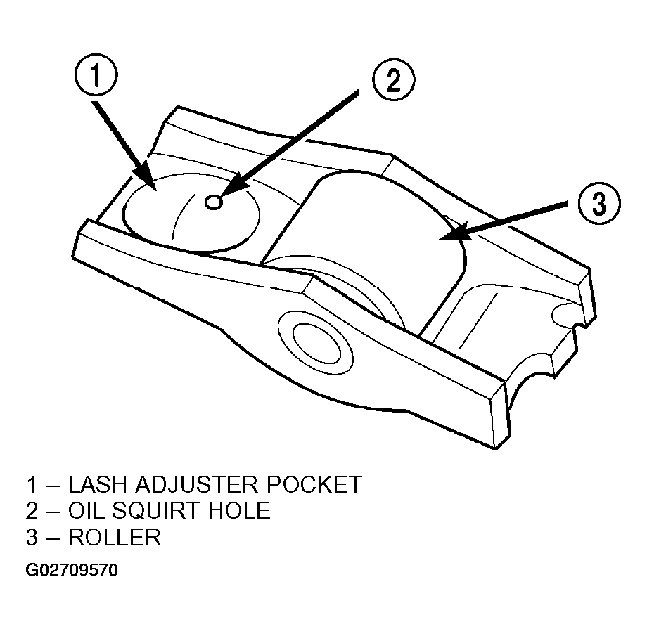 The rocker arms are composed of steel stampings with an integral roller bearing (Fig 1). The rocker arms incorporate a 0.5 mm (0.0197 in.) oil hole in the lash adjuster socket for roller/camshaft lobe lubrication (Fig 1).
