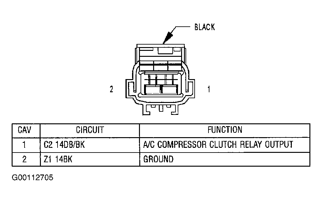 2. Turn ignition off. Disconnect A/C compressor clutch harness connector. Measure resistance between ground and Black wire at A/C compressor clutch harness connector. See Fig 1 . If resistance is less than 5 ohms, go to next step. If resistance is 5 ohms or more, repair open in ground circuit.