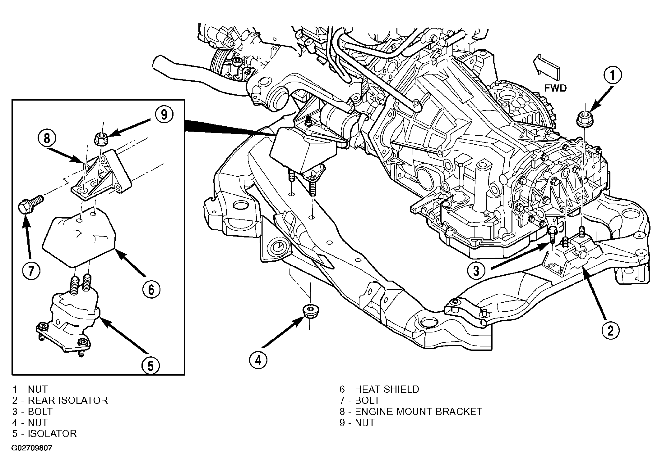 - Tighten the isolator to frame nuts to 61 N.m (45 ft. lbs.) (Figure).