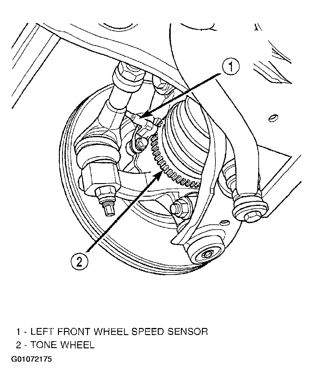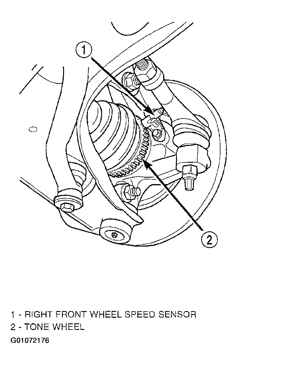 The front wheel speed sensors are attached to bosses in the steering knuckles. See Fig 1 and Fig 2 . There is a heat shield mounted between each sensor and the knuckle. The tone wheel is an integral part of the outboard constant velocity joint located in the front axle shaft.
