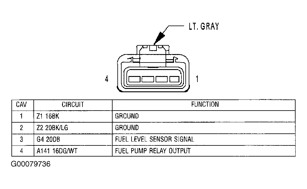 - Turn ignition off. Connect a test light between battery positive terminal and ground circuit (Black wire) at fuel pump module harness connector. If test light illuminates brightly, go to next step. If test light does not illuminate brightly, repair open in ground circuit. See WIRING DIAGRAMS .