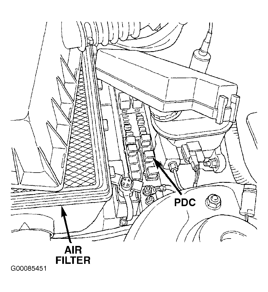 - Turn ignition off. Remove fuel pump relay from PDC. See Figure . PDC is located in engine compartment. See Figure . Connect a test light between ground and fused battery voltage circuit (Red/White wire) at terminal C5 at fuel pump relay harness connector in PDC. If test light illuminates, go to next step. If test light does not illuminate, repair open in fused battery voltage circuit.