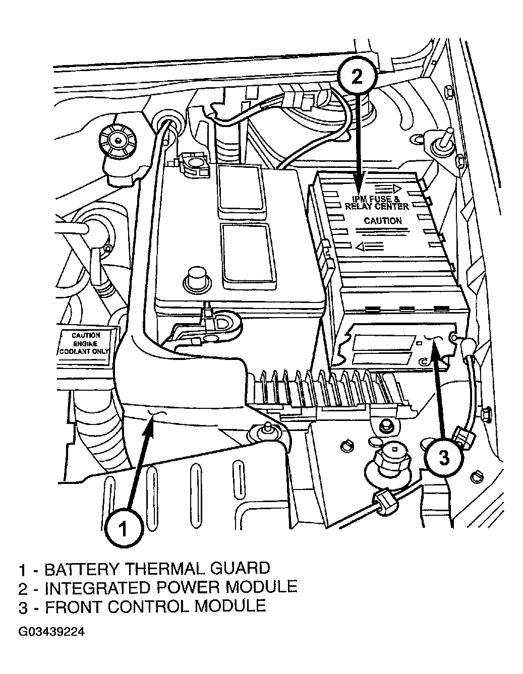 The Integrated Power Module (IPM) is a combination of the Power Distribution Center (PDC) and the Front Control Module (FCM). The IPM is located in the engine compartment, next to the battery on this model. SeeFig 1 . The power distribution center mates directly with the Front Control Module (FCM) to form the IPM Fuse and Relay Center. The power distribution center (PDC) is a printed circuit board based module that contains fuses and relays, while the front control module contains the electronics controlling the IPM and other functions. This IPM connects directly to the battery positive via a 4-pin connector. The ground connection is via two other connectors. The IPM provides the primary means of voltage distribution and protection for the entire vehicle.